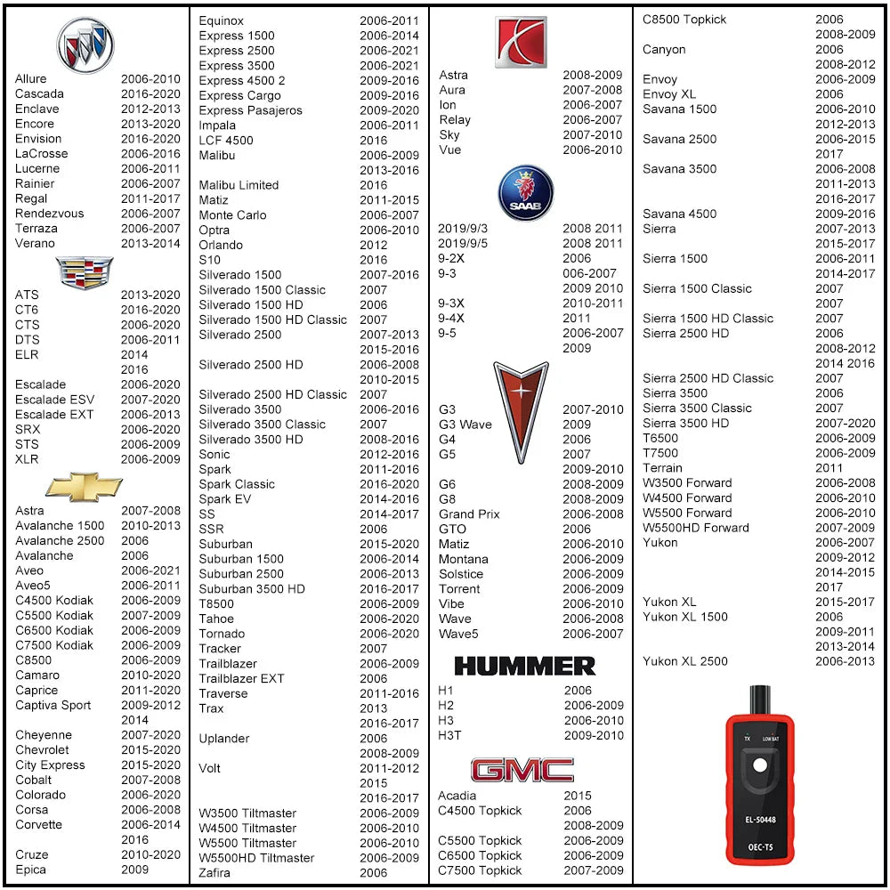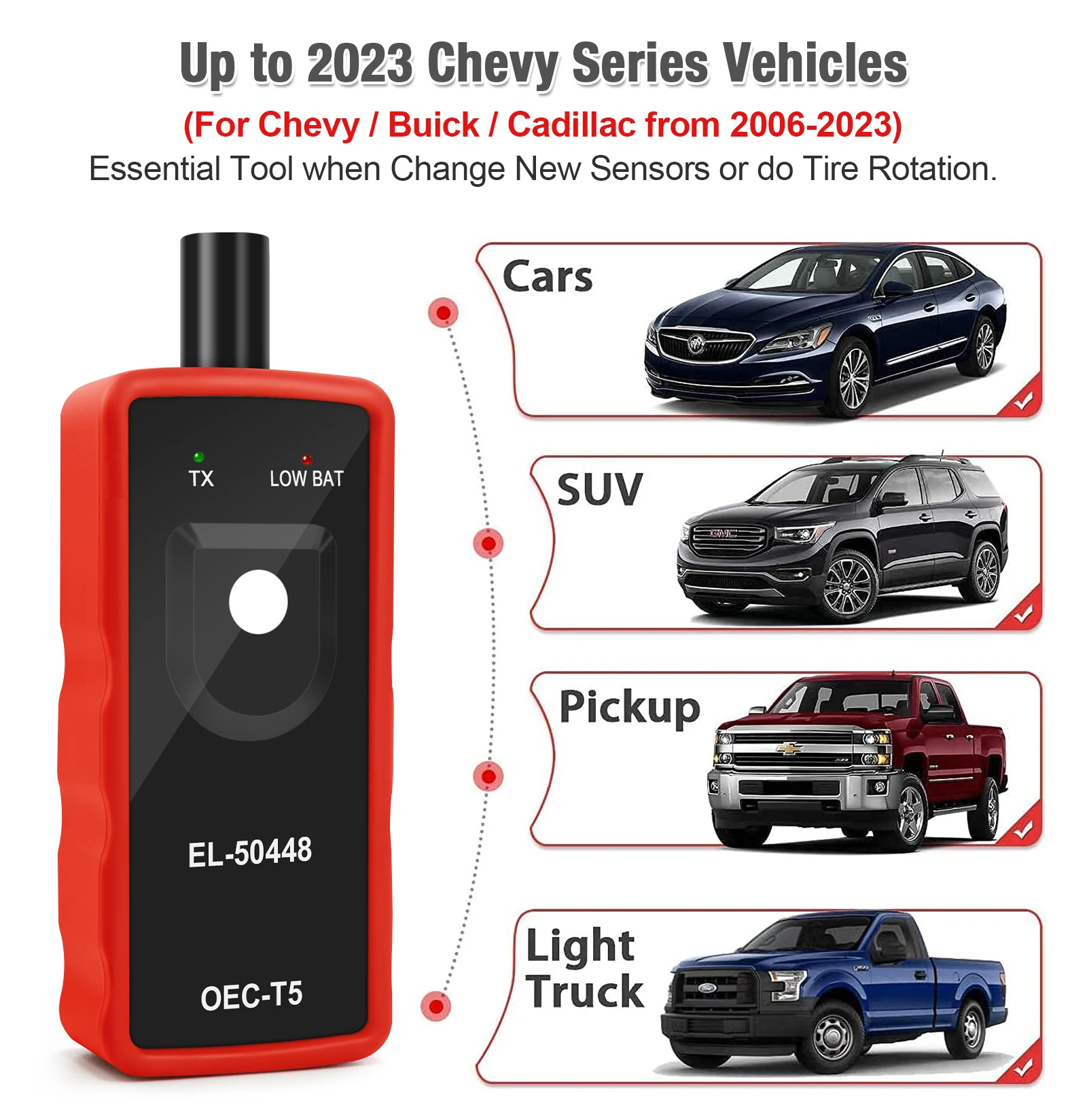 EL50448 works on most General Motors (for Buick, for Cadillac, for Chevrolet, for GMC) products manufactured for the North American market. It won't work if you've purchased aftermarket sensors that are the wrong frequency.