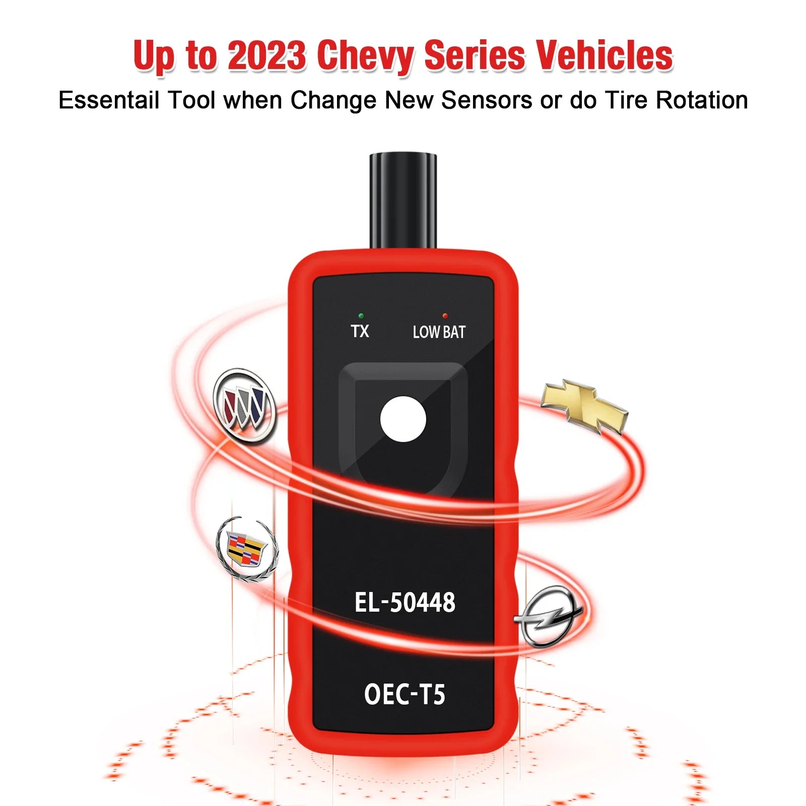 For GM vehicles equipped with a 315 or 433 MHz Tire Pressure Monitoring (TPM) system, a "Sensor Re-Learn Procedure" must be performed after tire rotations, Remote Control Door Lock Receiver Module replacement or Tire Pressure Sensor replacement. This re-learn procedure can be performed by using special device EL-50448. Also works on 2023 GM models