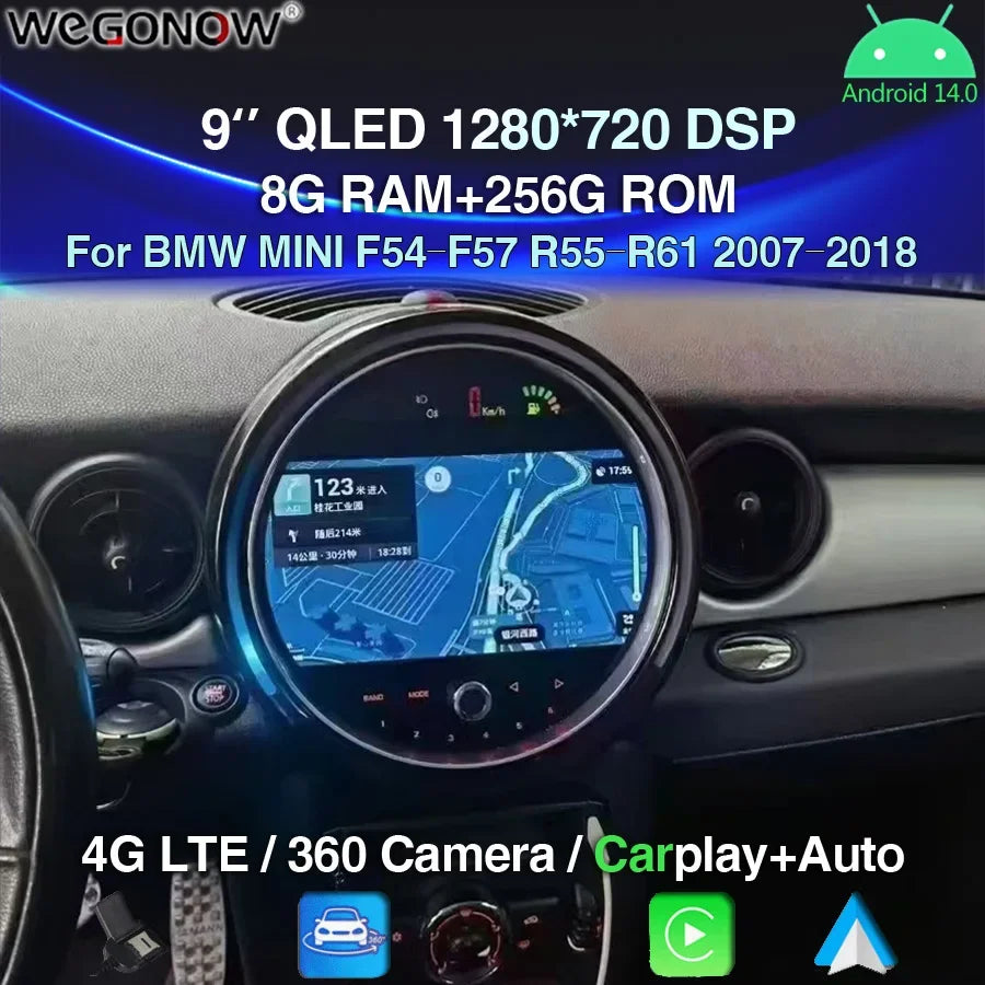 Carplay 8G+256G 9'' Android 14.0 Car multimedia Player Navigation GPS 4G LTE Stereo Radio For BMW MINI F54-F57 R55-R61 2007-2018