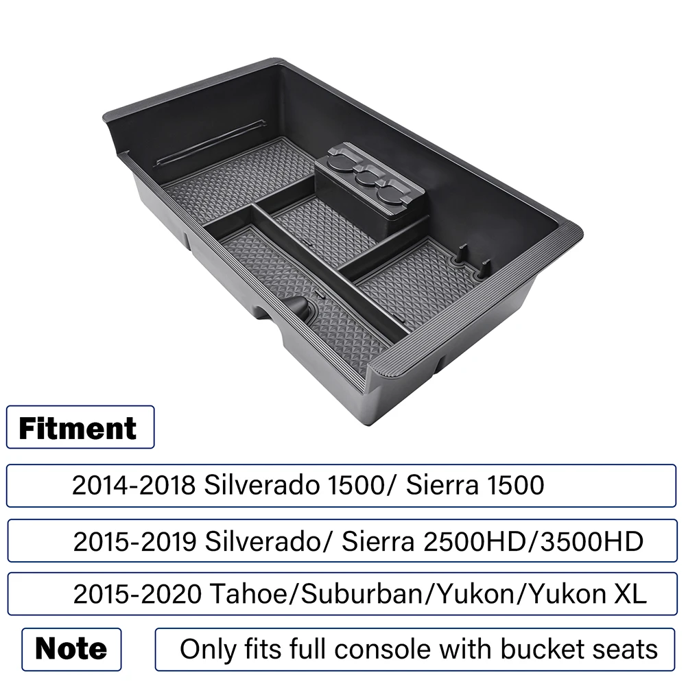 FITMENT:Only fits full console with bucket seats.NOT for split bench seat(includes 40/20/40 jump) for Chevrolet Silverado 1500 2014 -2018, for Chevrolet Silverado 2500 HD 2015 -2019, for Chevrolet Silverado 3500 HD 2015 -2019, for Chevy/Chevrolet Tahoe 2015-2020, for Chevy/Chevrolet Suburban 2015-2020, for GMC Sierra 1500 2014-2018, for GMC Sierra 2500 HD 2015 -2019, for GMC Sierra 3500 HD 2015 -2019, for GMC Yukon 2015-2020, for GMC Yukon XL 2015-2020.