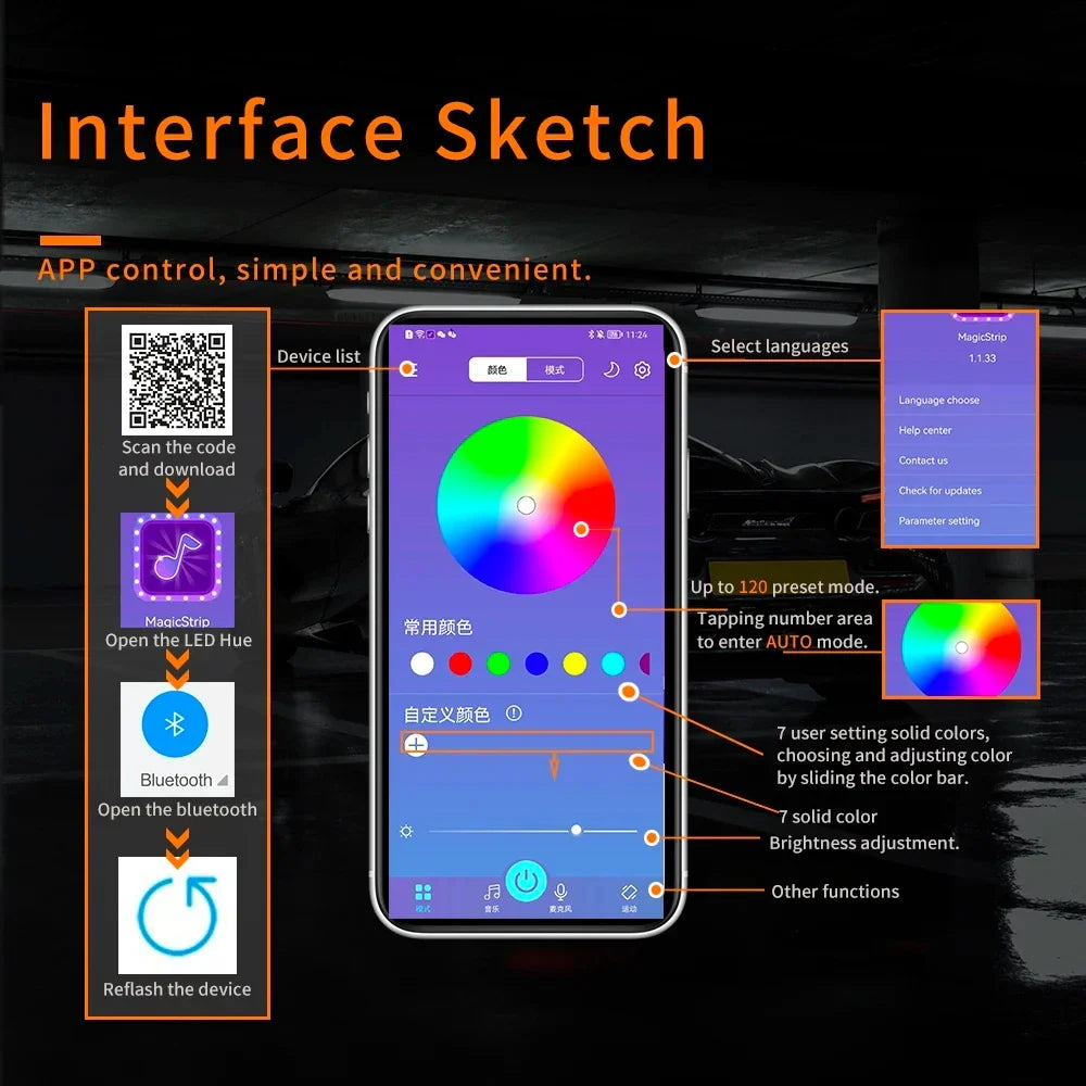 MULTI-FUNCTION: Smart phone scans the QR Code to download the APP,open the APP, connection successful,choose the pattern you prefer.it can Adjust brightness and the color temperature,make your car more personalized
