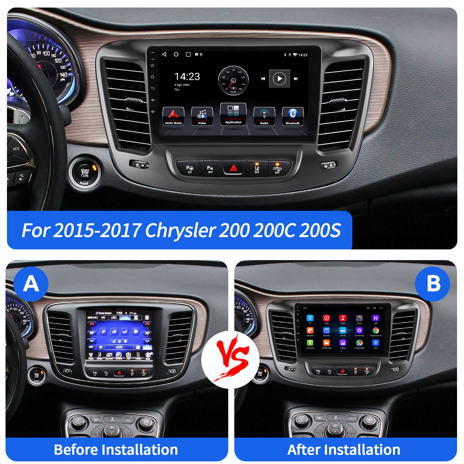 9 Inch Android 14 Car Radio For Chrysler 200 200C 200S 2015-2019 :The Android car radio with 9" 1280*720 IPS capacitive touch screen.No additional frame, no cable change, plug and play. It comes with Canbus and supports most of the original functions: steering wheel control, reverse signals and reading original computer data, etc.