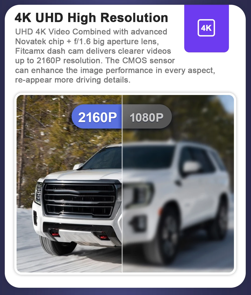 UHD 4K Video Combined with advanced Novatek chip + f/1.6 big aperture lens, Fitcamx dash cam delivers clearer videos up to 2160P resolution. The CMOS sensor can enhance the image performance in every aspect, re-appear more driving details.