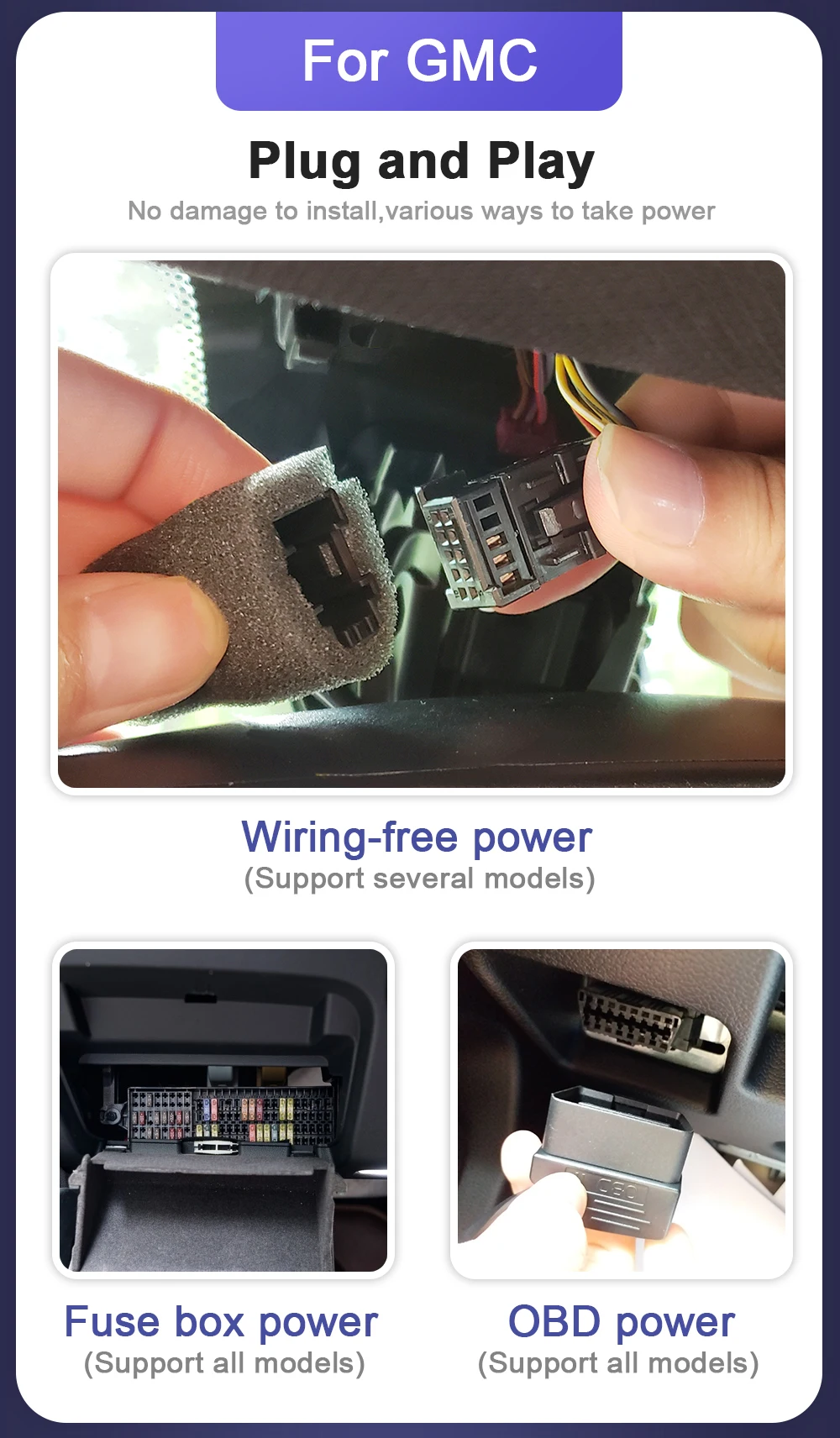 No damage to install, various ways to take power. It takes power from Auto-dimming rear view mirror. The plug and play cable is sent by default, if you need to replace the fuse box cable or OBD cable, please contact us before sending.