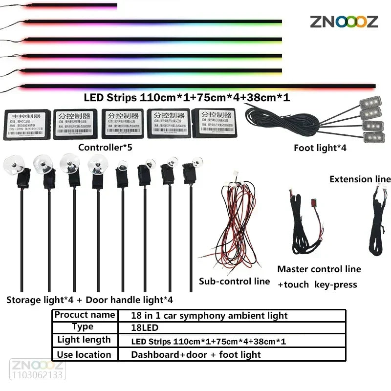- Item Type : 22 in 1 ( 6 * LED strip(110cm*1+75cm*4+38cm*1 + 4 * Footlight + 4 * Door bowl lights + 4 * Storage lights+4*Loudspeaker ambient light)