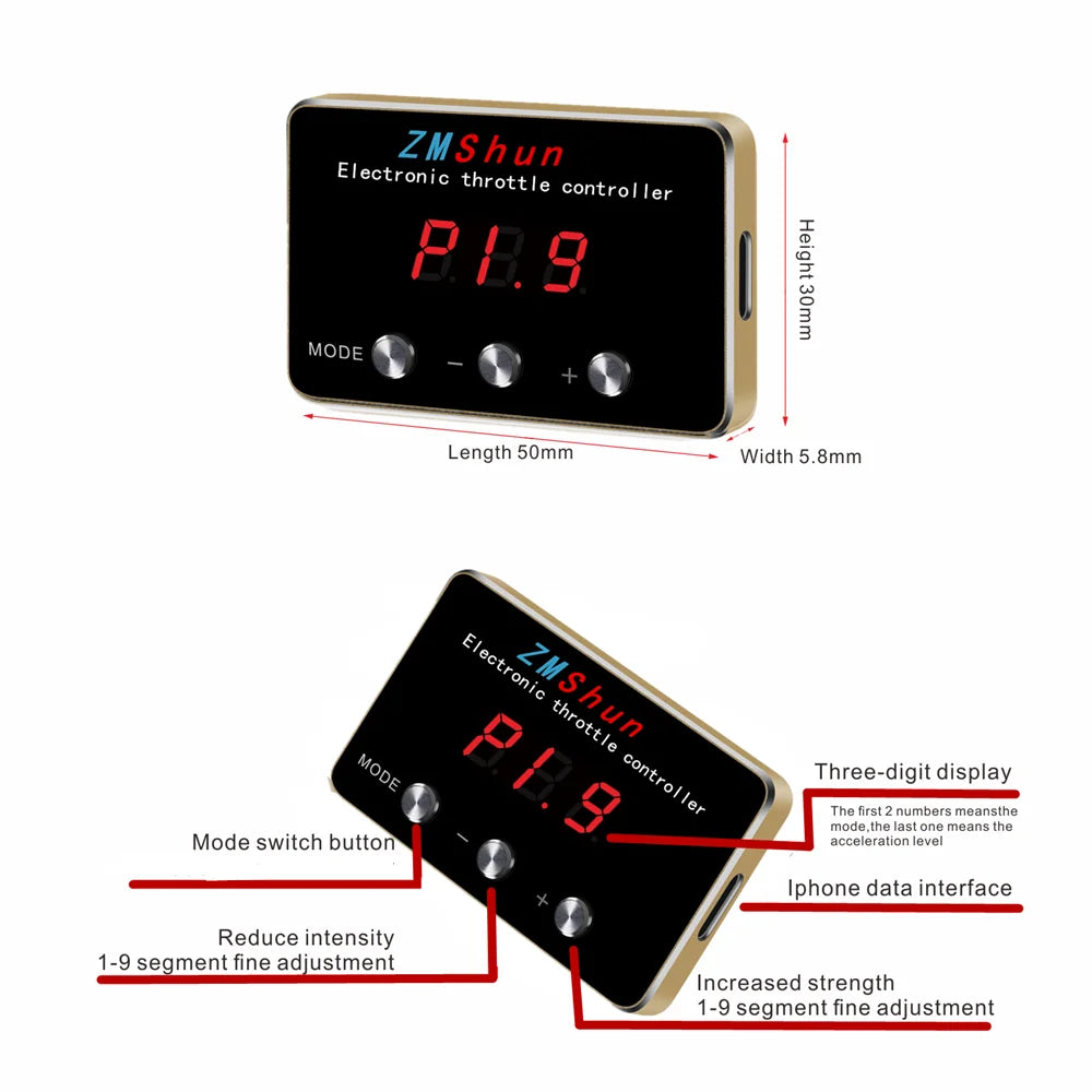 The Electronic Throttle Accelerator Controller is a booster which control car throttle open to improve the sensitivity driving experience of the car to adapt to different driving habits and keep in a better driving conditions.Solve the slowly start. Increase the throttle respond speed. Improve the instantaneous acceleration. Decrease engine carbon deposition. Avoid vehicle go forward suddenly. Fuel-efficient. Achieve the best speed rate.