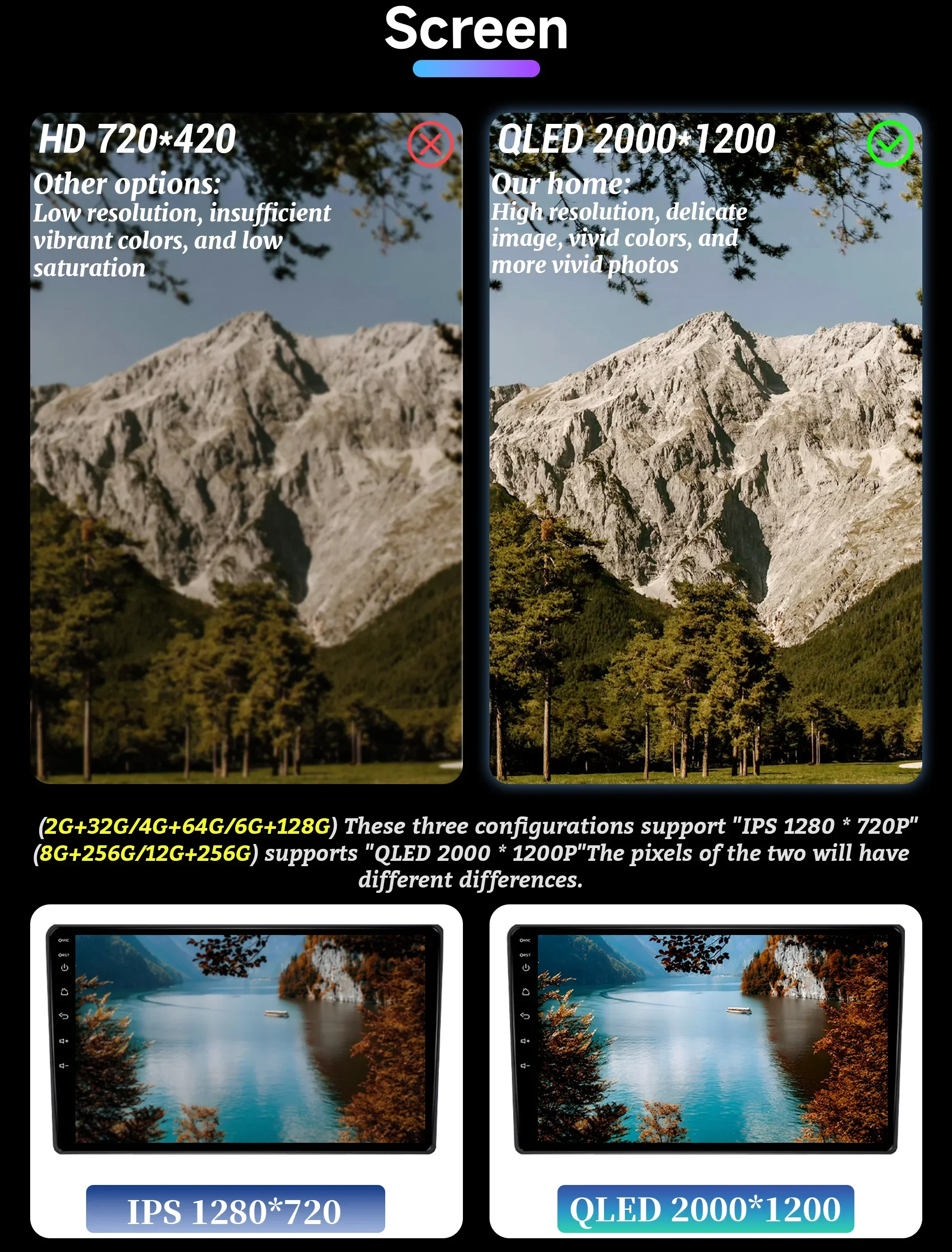 Screen: 1280*720 high-resolution IPS Touch Screen/8+256G 2000*1200 2K QLED Touch Screen