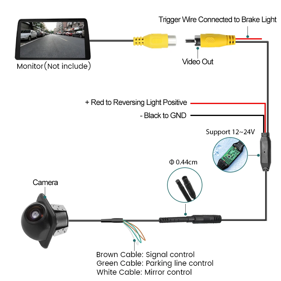 • The camera with the parking line/camera does not display the parking line, you can cut the green cable, and then reconnect the camera's power supply, which can change the parking line.