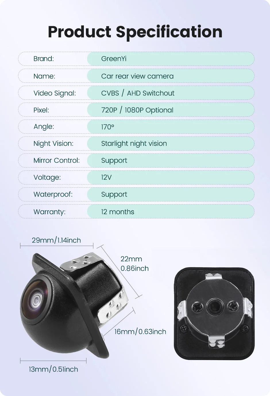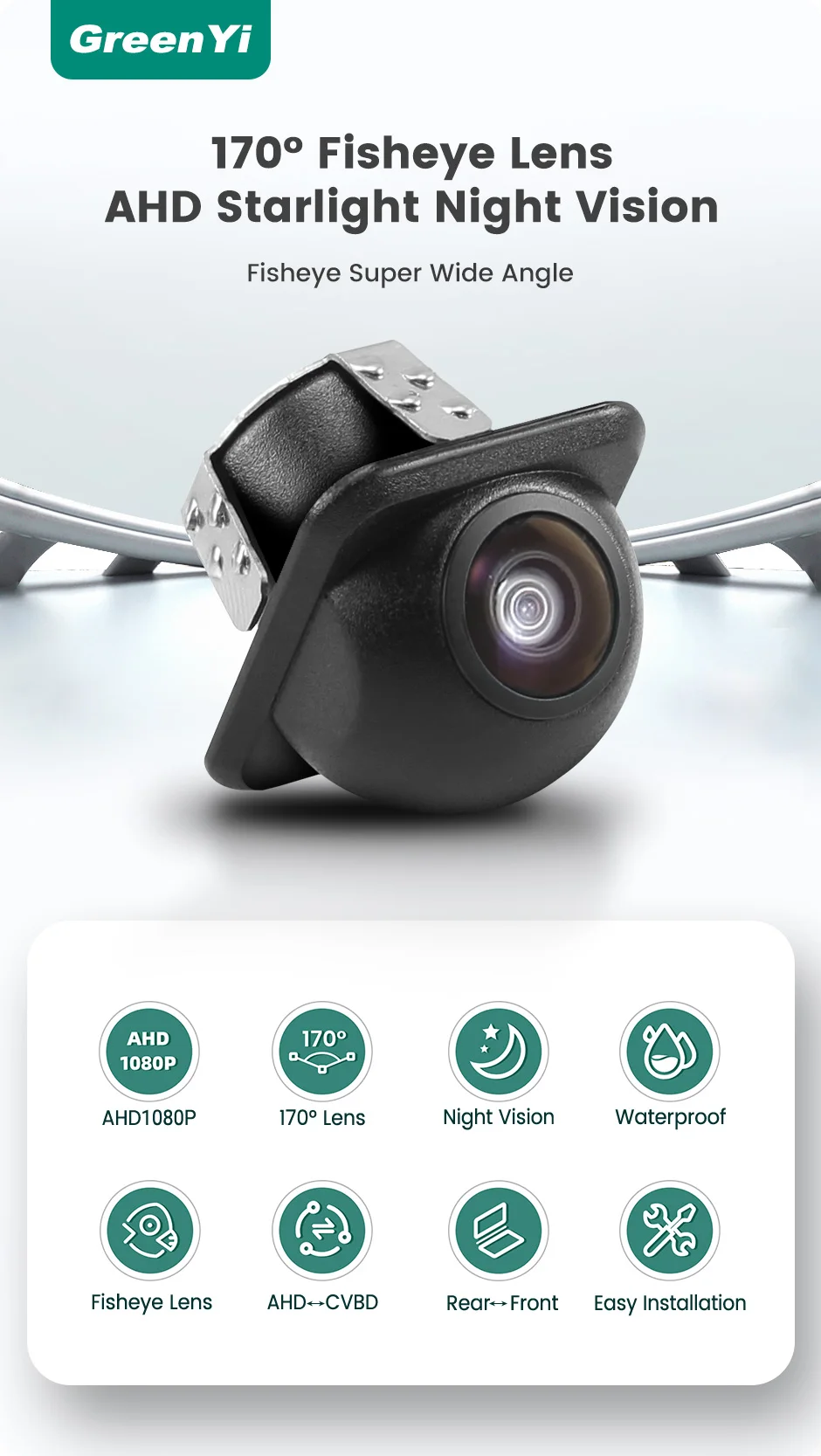 GreenYi AHD 1920x1080P Car Rear View Camera Full HD Night Vision 170° Fisheye Lens Vehicle Reversing Front Cam C801