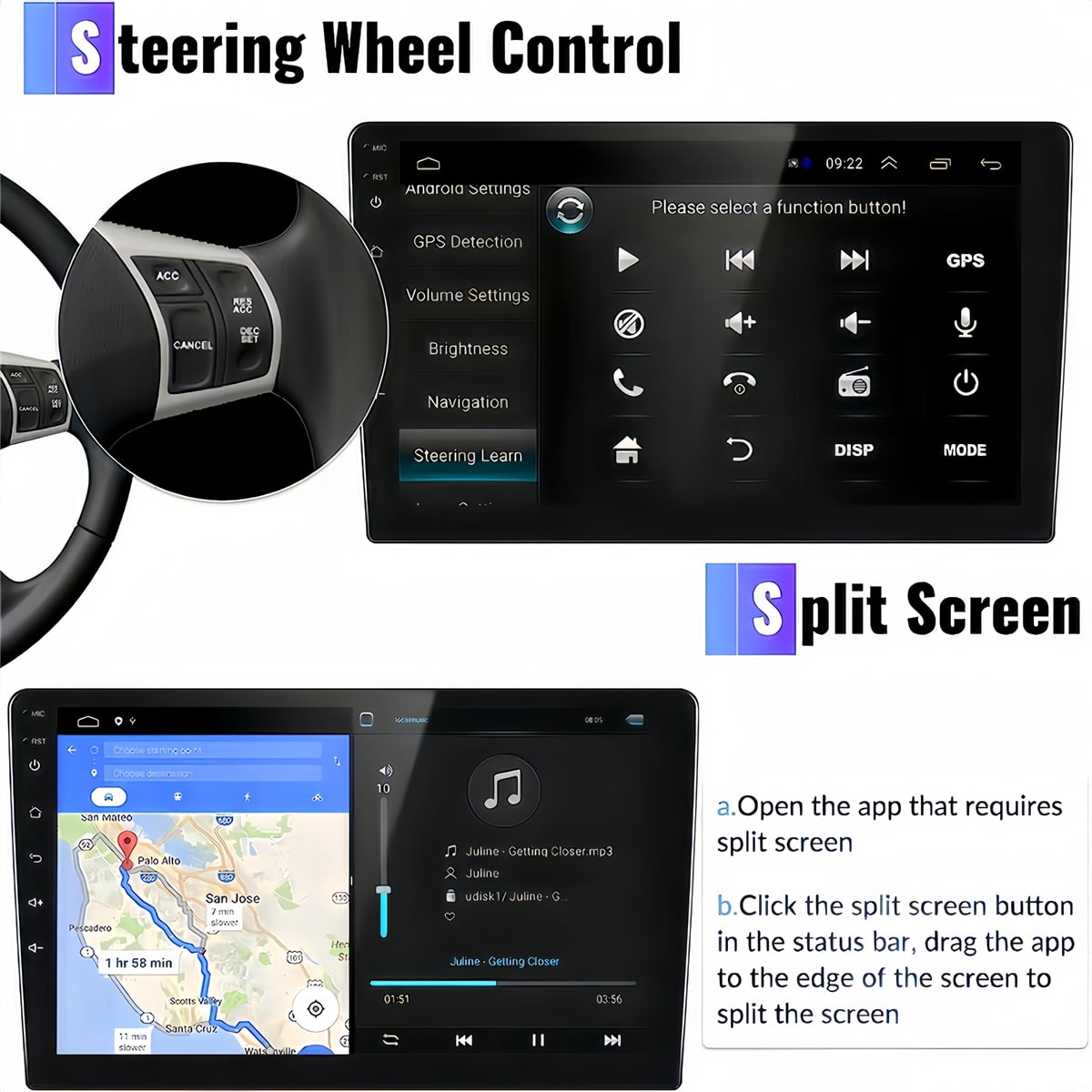 Steering Wheel Control: Quickly convert functions which you want with your car's steering wheel, more convenient. Just connect the swc wire of your vehicle to the key1 wire of this unit, follow the instruction to study buttons, then you can use the vehicle's existing steering wheel control buttons.