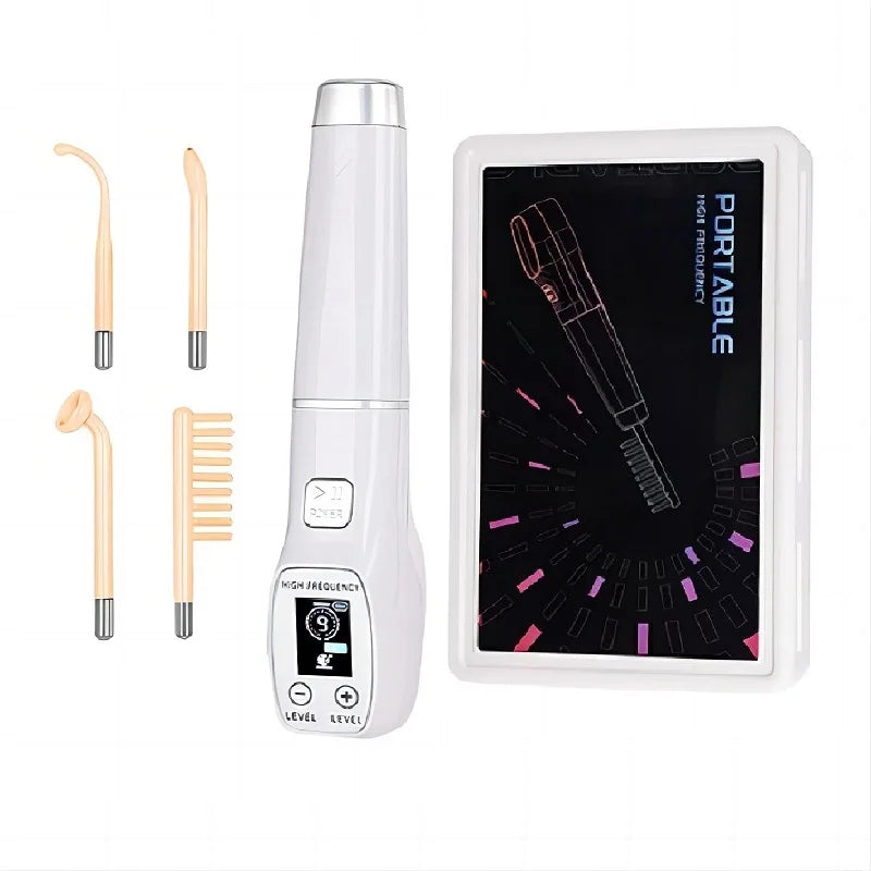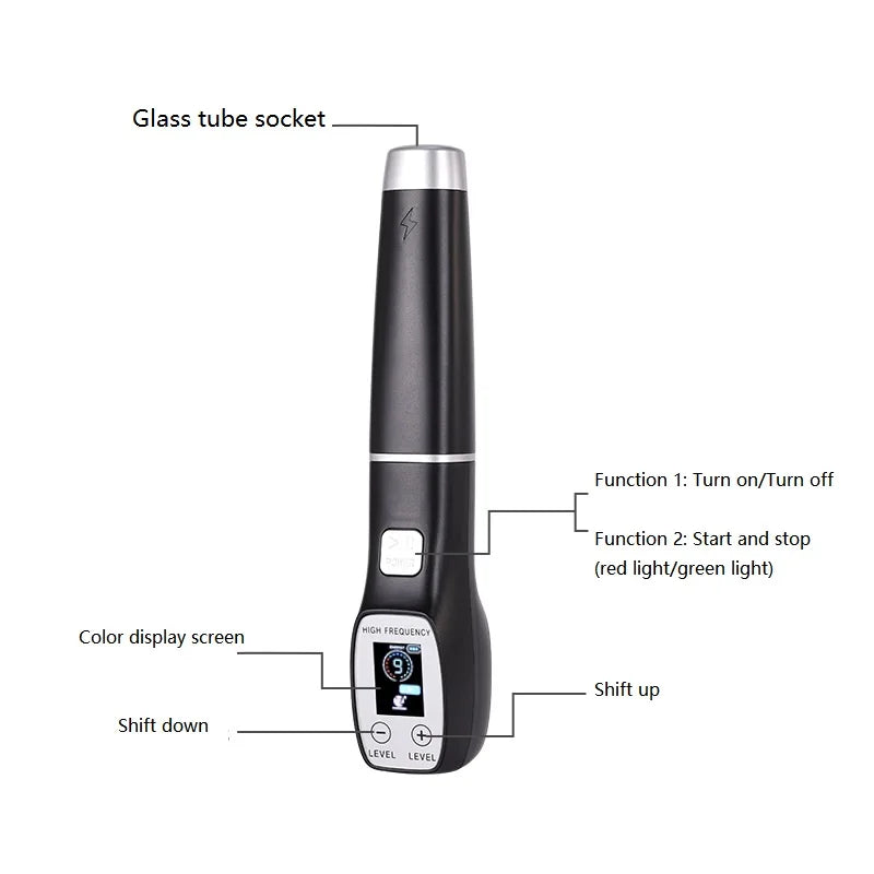 1:Portable high-frequency machine through new fusion glass electrode tube (Ar+Ne) to produce high-frequency current, accelerate the blood circulation and the metabolism to Anti-acne treatment and promote acne healing, reduce wrinkle and tighten skin, prevent hair loss and stimulate grow new hair.