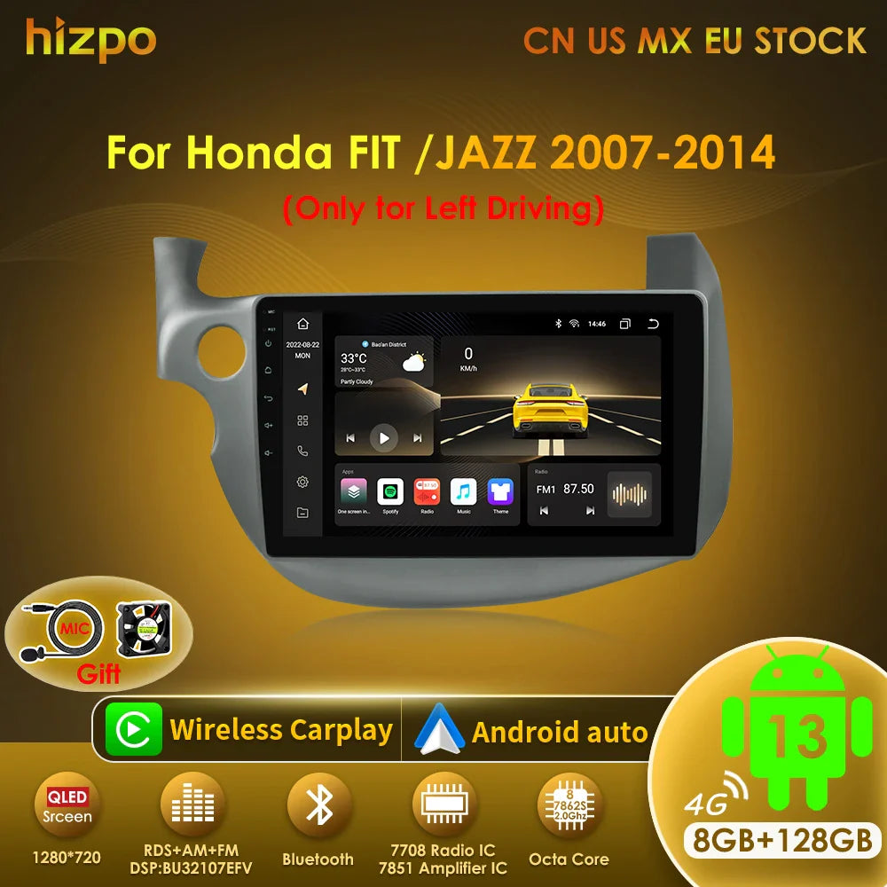 Hizpo 2 Din Android 13 Car Radio For HONDA FIT JAZZ 2007-2013 Multimedia Video Player AI Voice Wireless CarPlay Auto Head Unit
