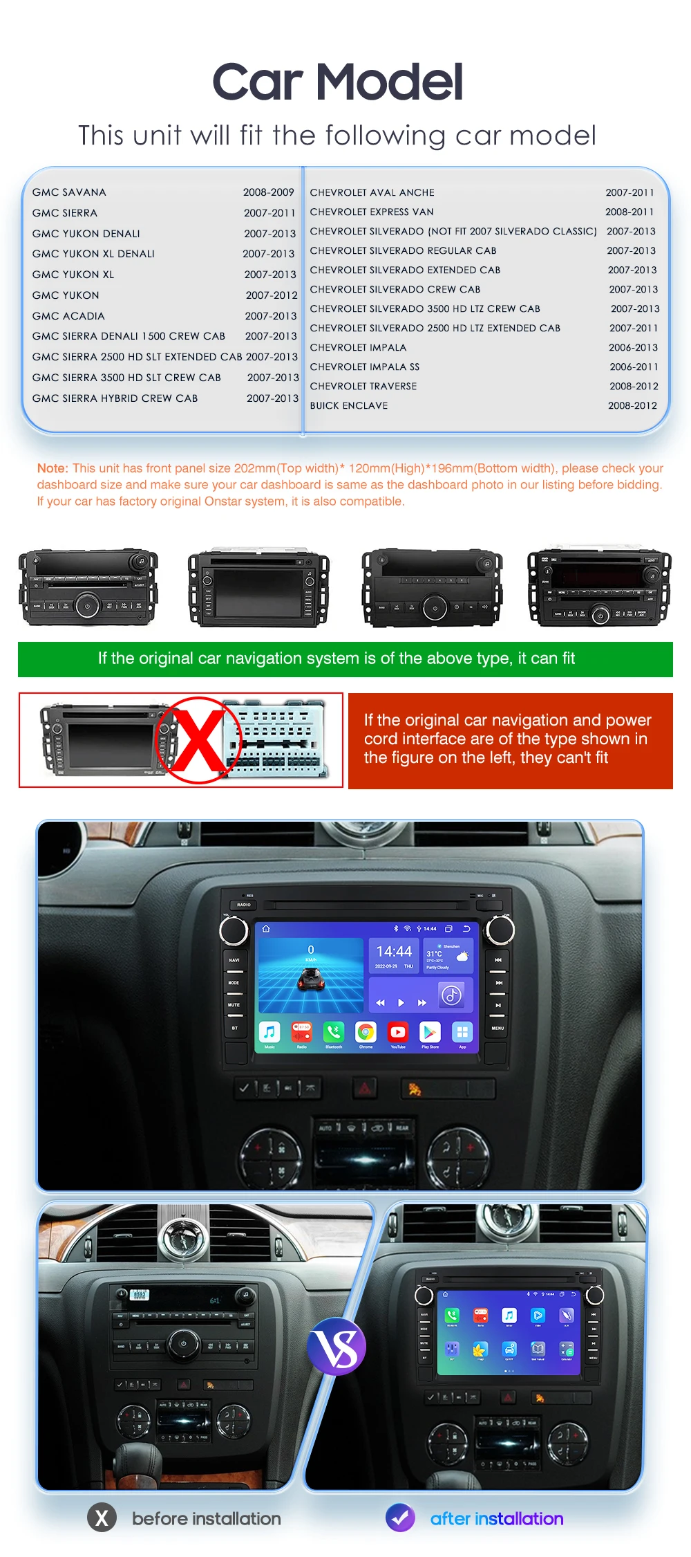① Please check your original car radio size and appearance & its compatible list with the Notice details before make a order bid to avoid mistake; if needs other adapter for installed which needs to order separately except the description accessories picture shows.