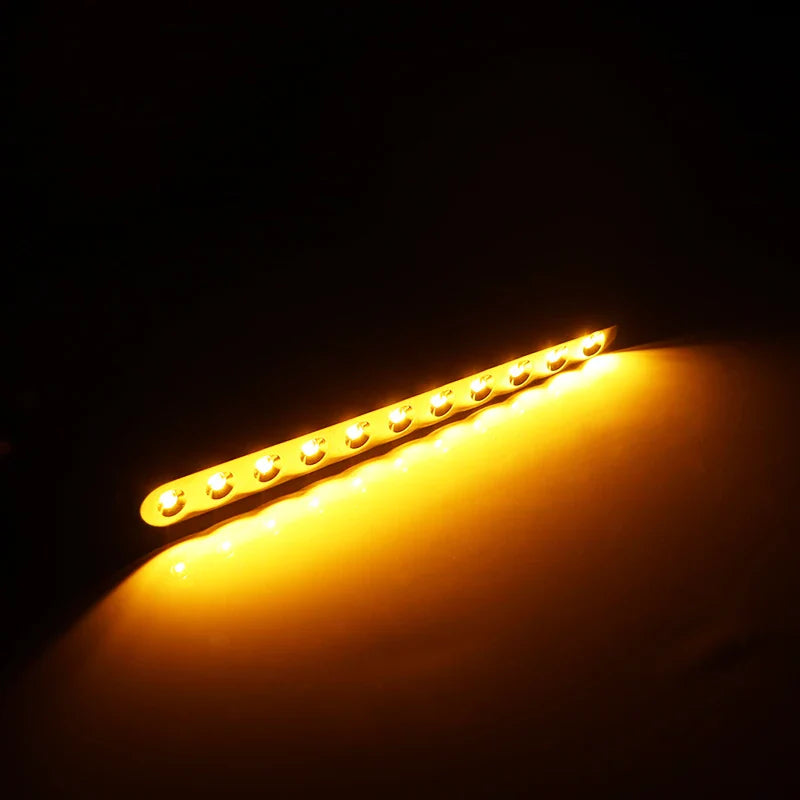 This LED assembly is powered by 22pieces of amber yellow genuine super bright NICHIA LED Super Flux for the turn signal function and xenon white 21pieces continuous fiber optics LED for daytime running light function. Unlike conventional assemblies on the market, this LED DRL/turn signal assembly has a far superior turn signal function that is amazingly bright.