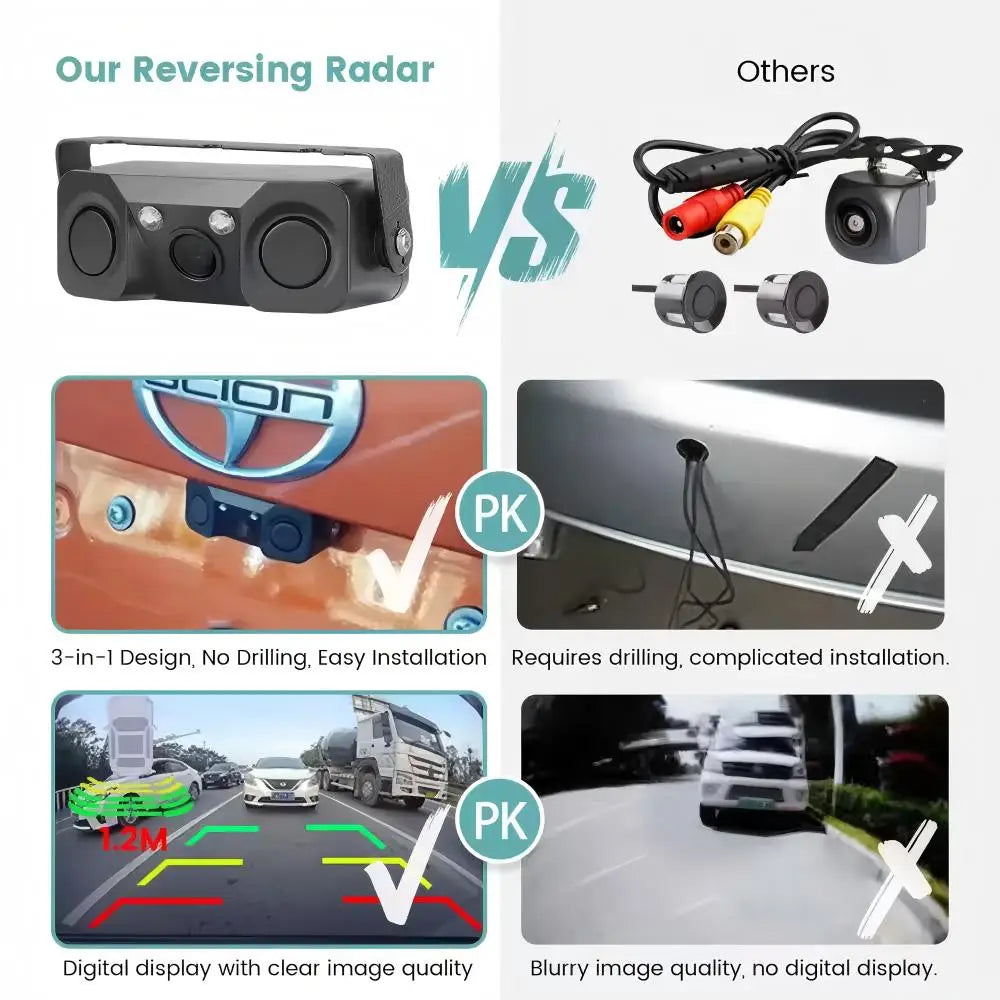 New design 3 in 1 radar with rear view camera, accurately measuring the obstacle distance, display reverse video and obstacle distance data on the monitor screen of the car at the same time, with it you can park your car more safely and conveniently.