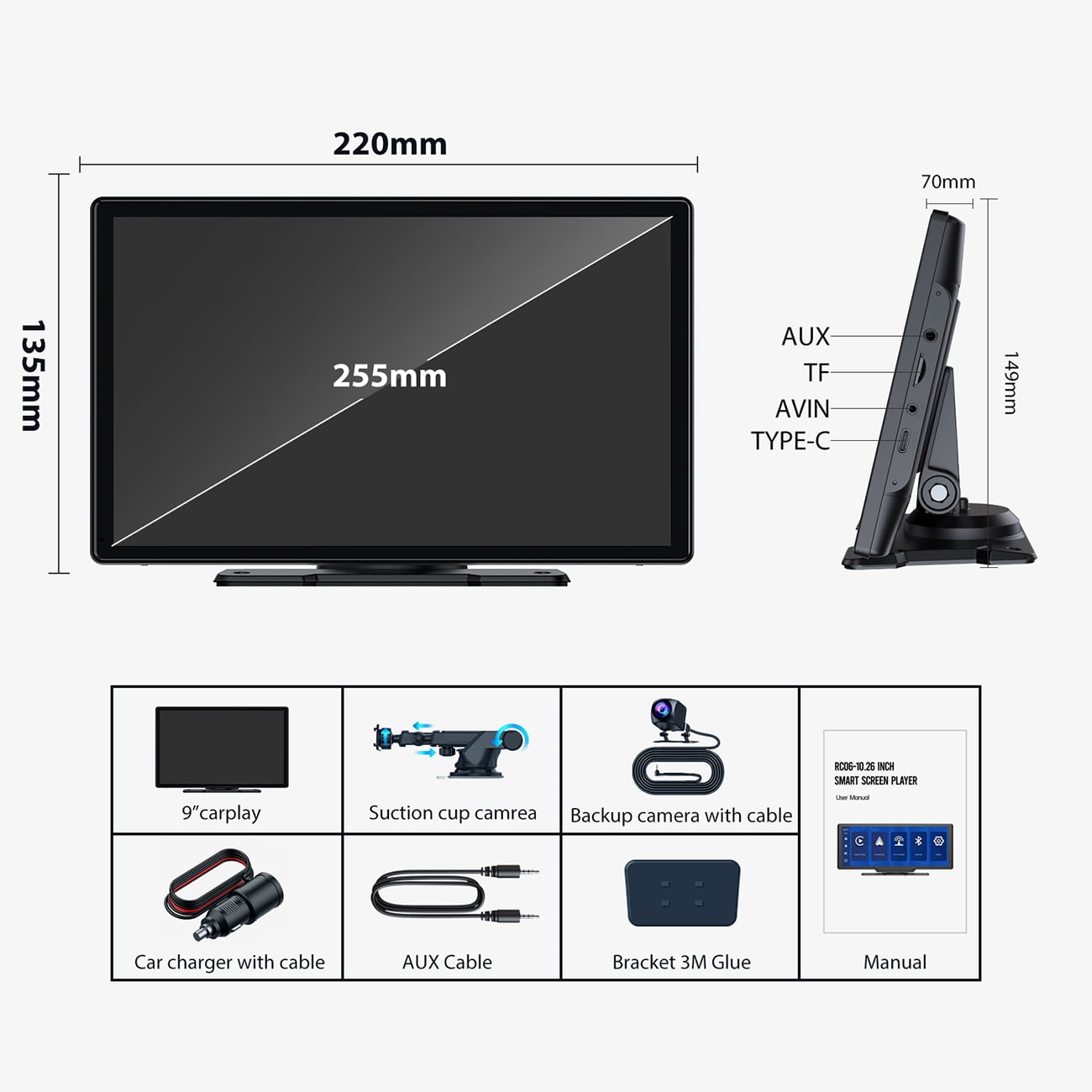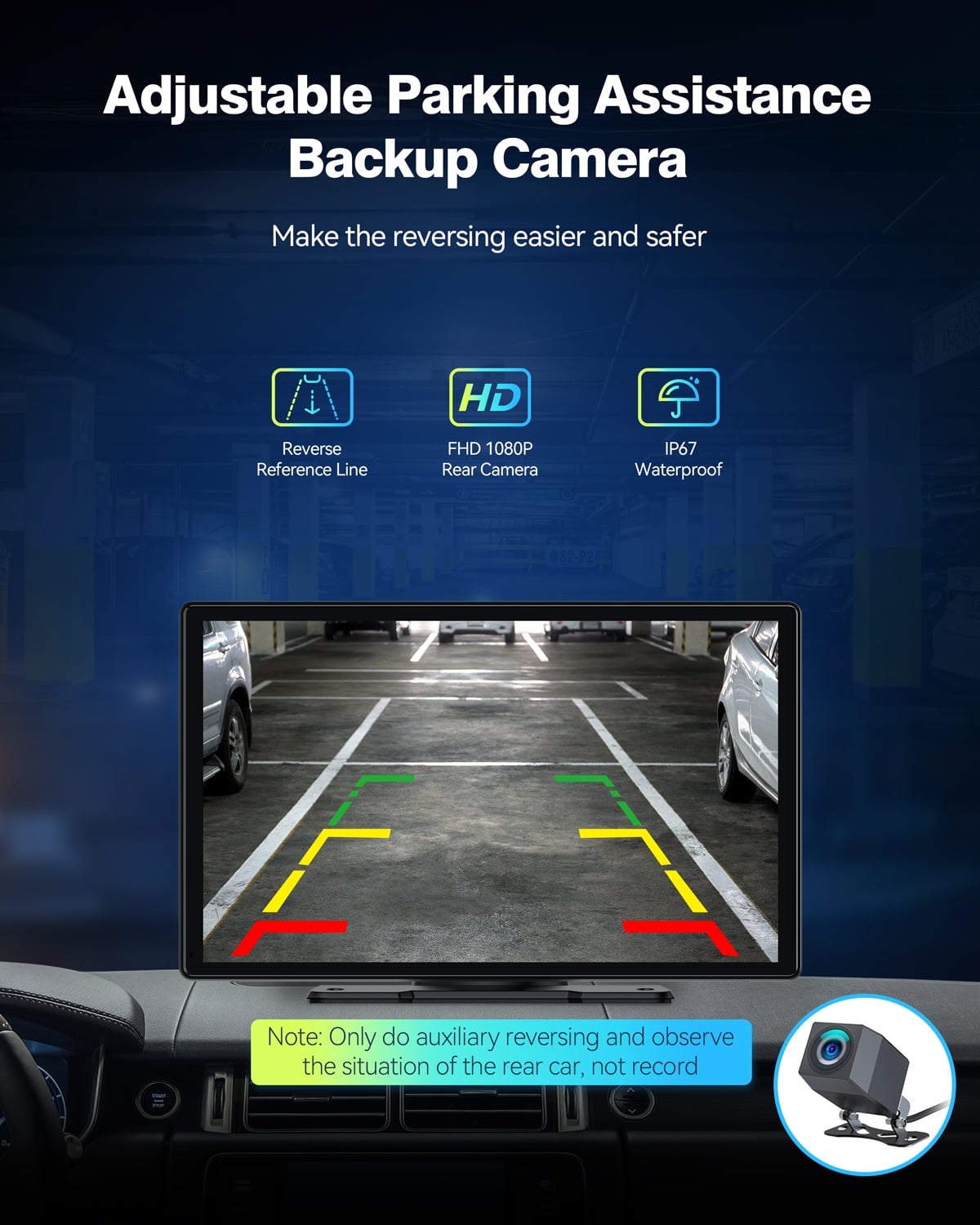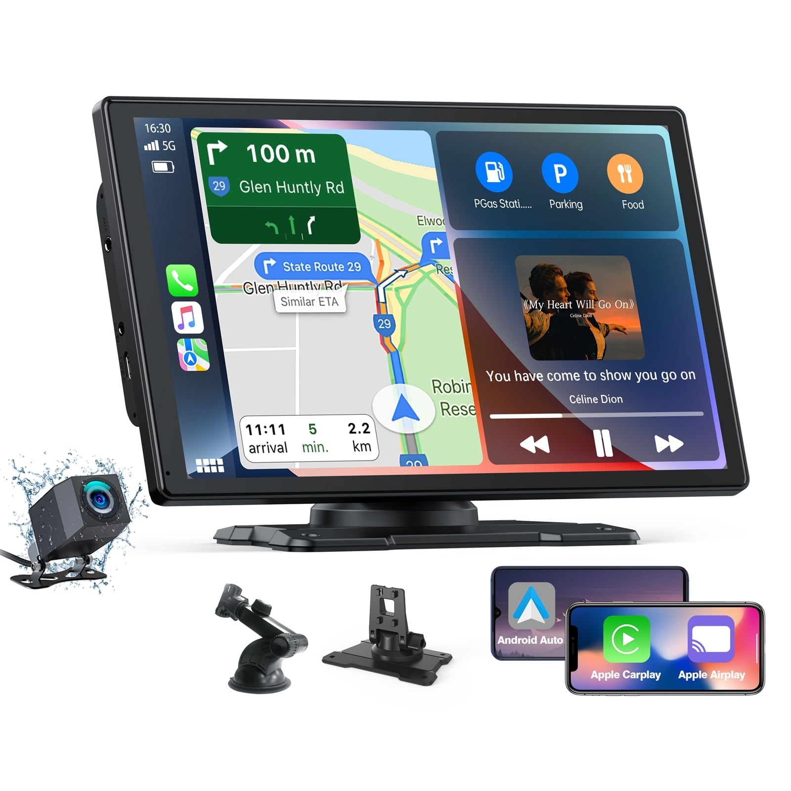 Lamtto 9 inch Wireless Apple Carplay and Android Auto,Portable Touch Screen Car Stereo, with Bluetooth, FM, GPS Navigation, Siri, 1080P Backup Camera