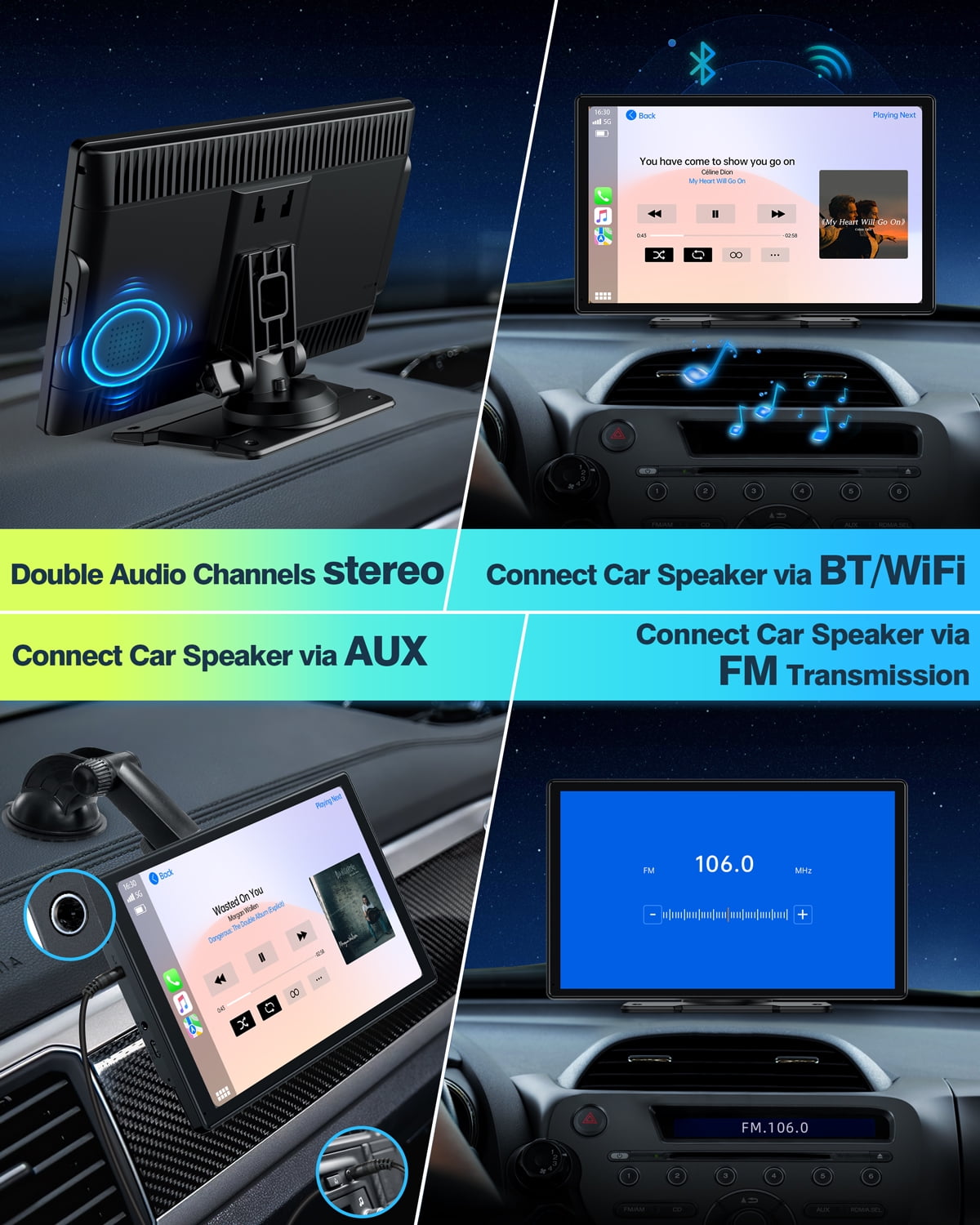 Lamtto Car Audio Stereo System, this Apple Portable Carplay features intelligent voice control so you can free your smartphone. Siri voice lets you control hands-free Get directions, find points of interest, check and reply to messages, play music, and more. Three audio modes: local speaker, AUX, and FM. Local speaker means that the device itself has a speaker. AUX output means that the sound of the product can be output to your original car radio by connecting to the AUX input port of the car. FM Transmitter: Transmit the sound of this product to your original audio system via the FM transmitter. Portable car audio supports wireless Apple Carplay, enjoy convenience and make life better!