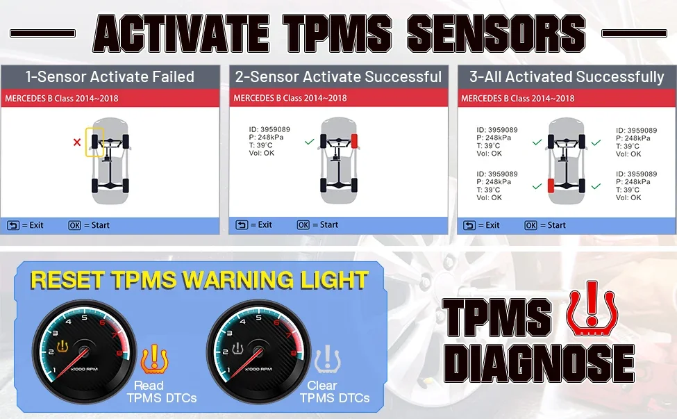 LAUNCH X431 TSUN can quickly activate the ID, wheel pressure, sensor frequency, tire temperature and battery status of the live sensor.