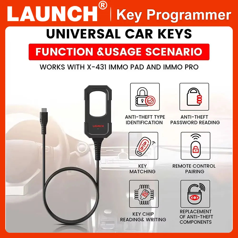 It works with LAUNCH X431 IMMO PLUS/ IMMO ELITE, X431 PAD V , X431 PRO V5.0 , X431 PRO3S+ V5.0 , X431 PRO Elite etc