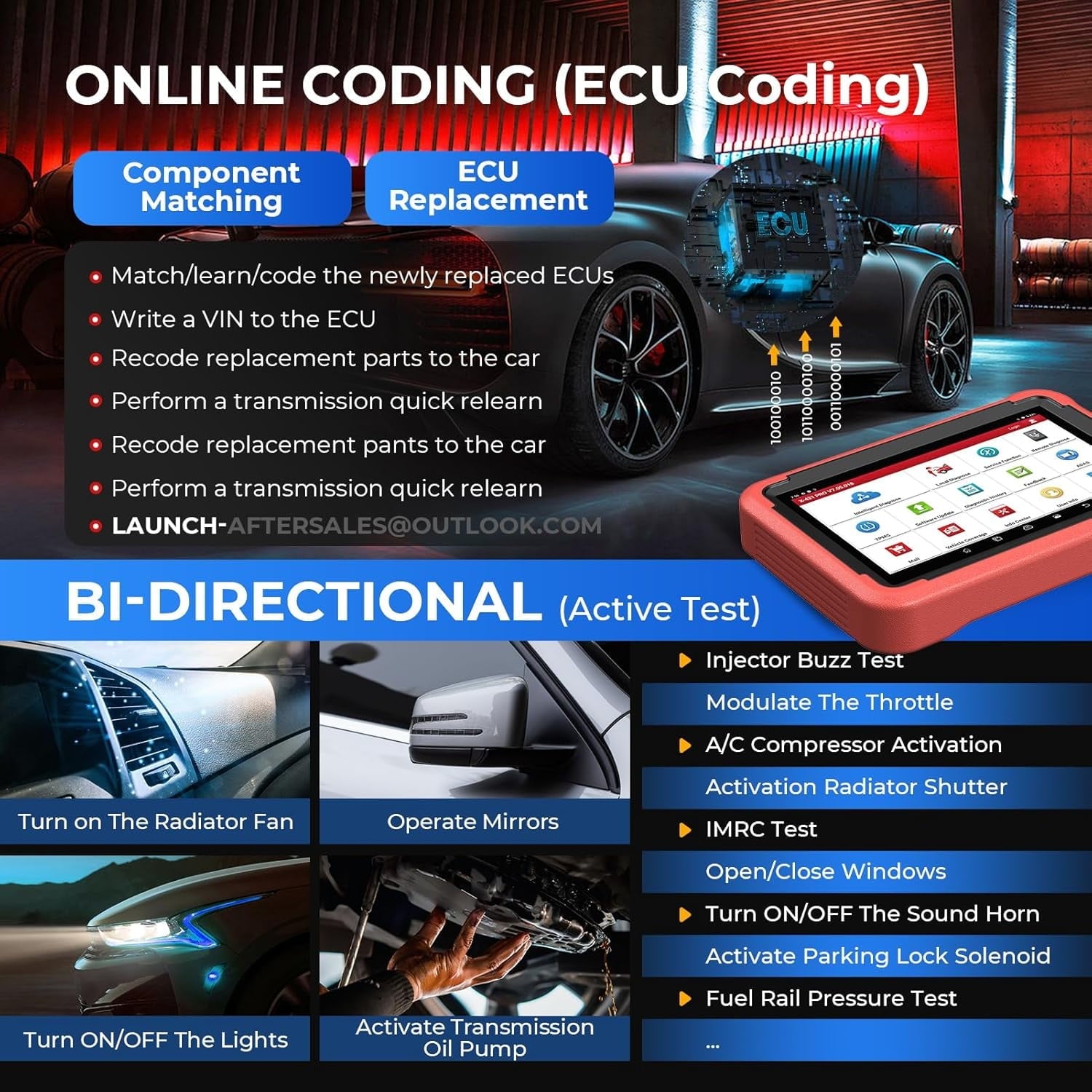- LAUNCH X431 pro scan tool with full-featured bi-directional control ability can actuate solenoids and actuators for active testing, send commands to many systems/components to test their working status, without using the vehicle controls.Turn on the radiator fan, modulate the throttle, open/close windows, operate mirrors, Injector Buz Test,turn on interior & exterior lights, sound horn, test door lock actuators etc 【Technology Itself is Proof of Quality】