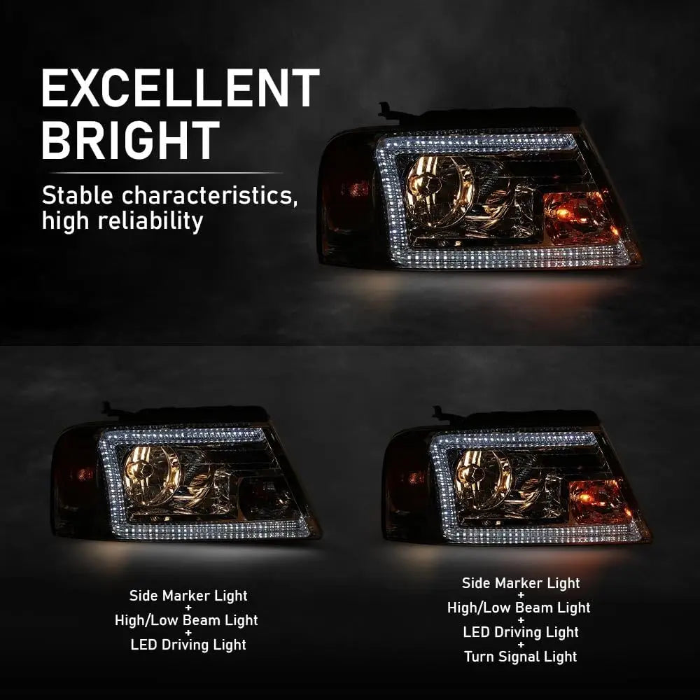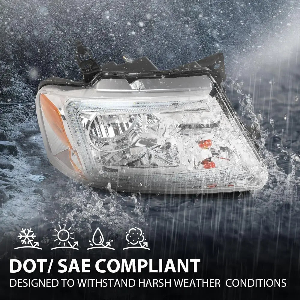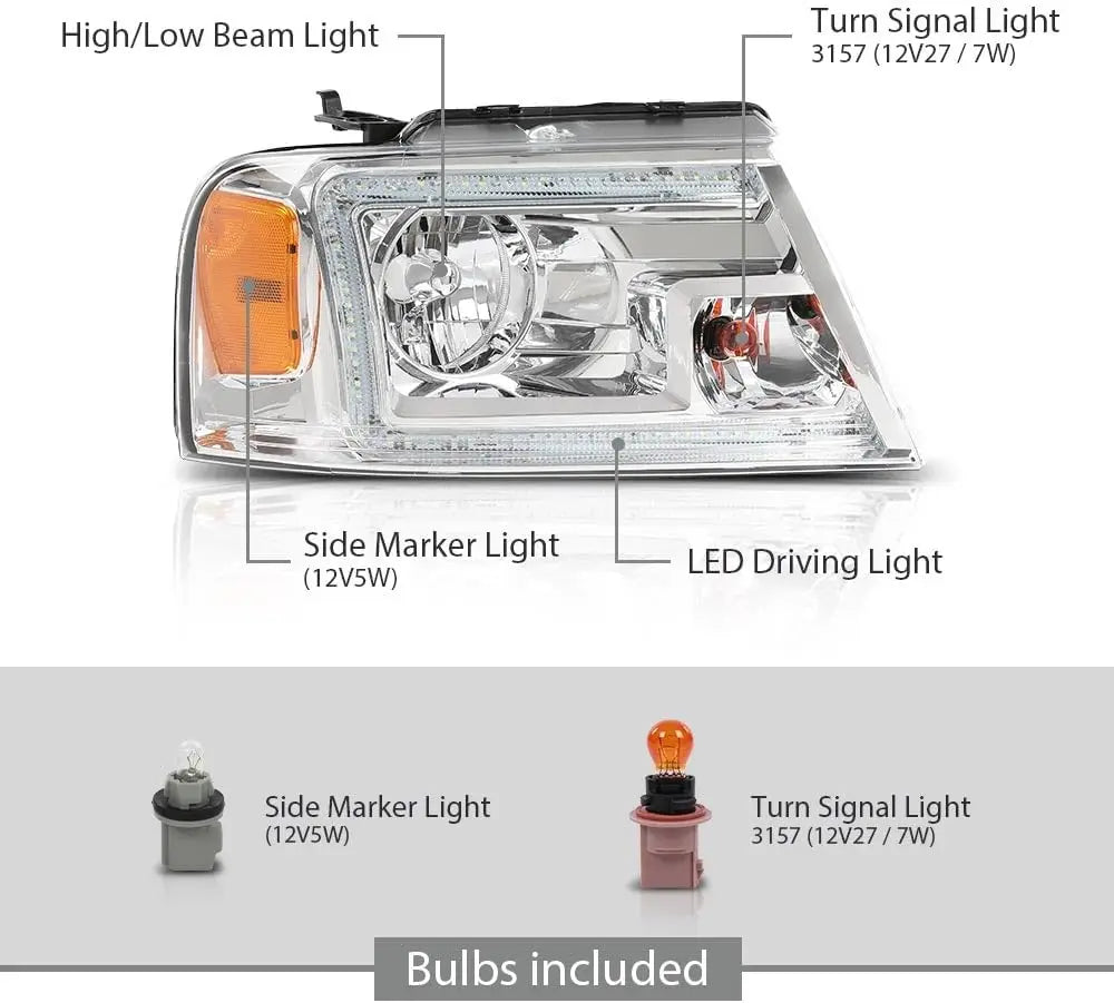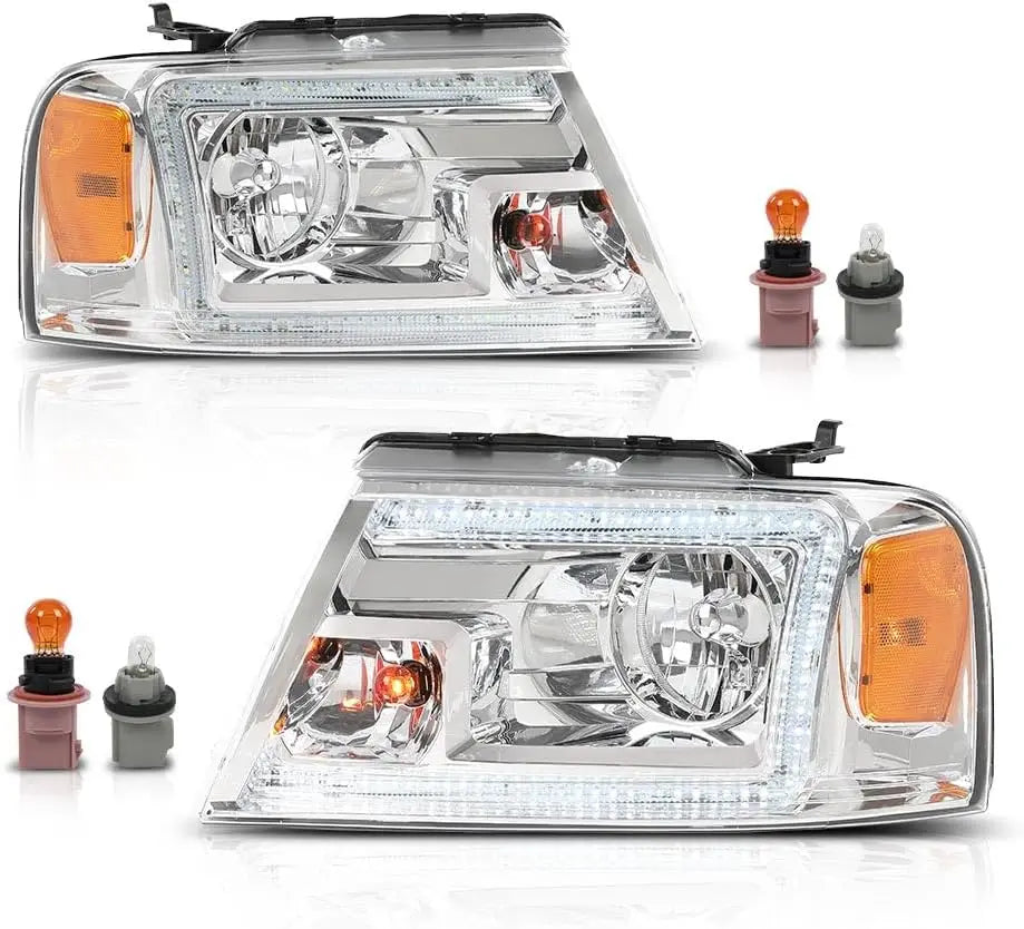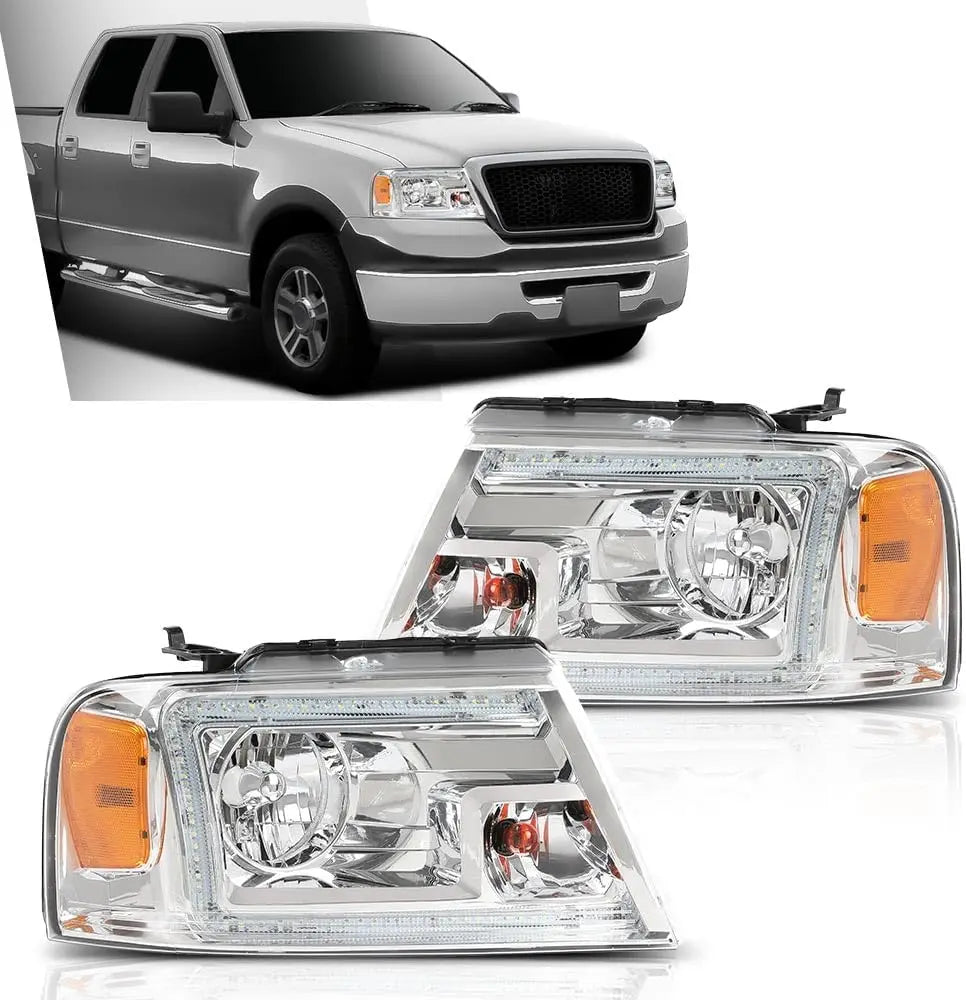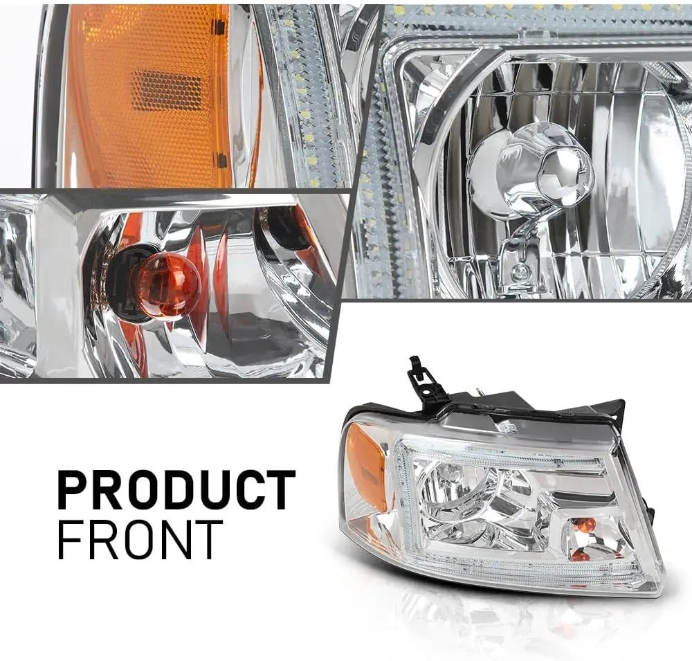 LED DRL Headlights Left& Right Halogen Compatible with Ford F150 2004-2008, Fit Lincoln Mark LT 2006-2008, Clear Lens Chrome Housing Amber Reflector