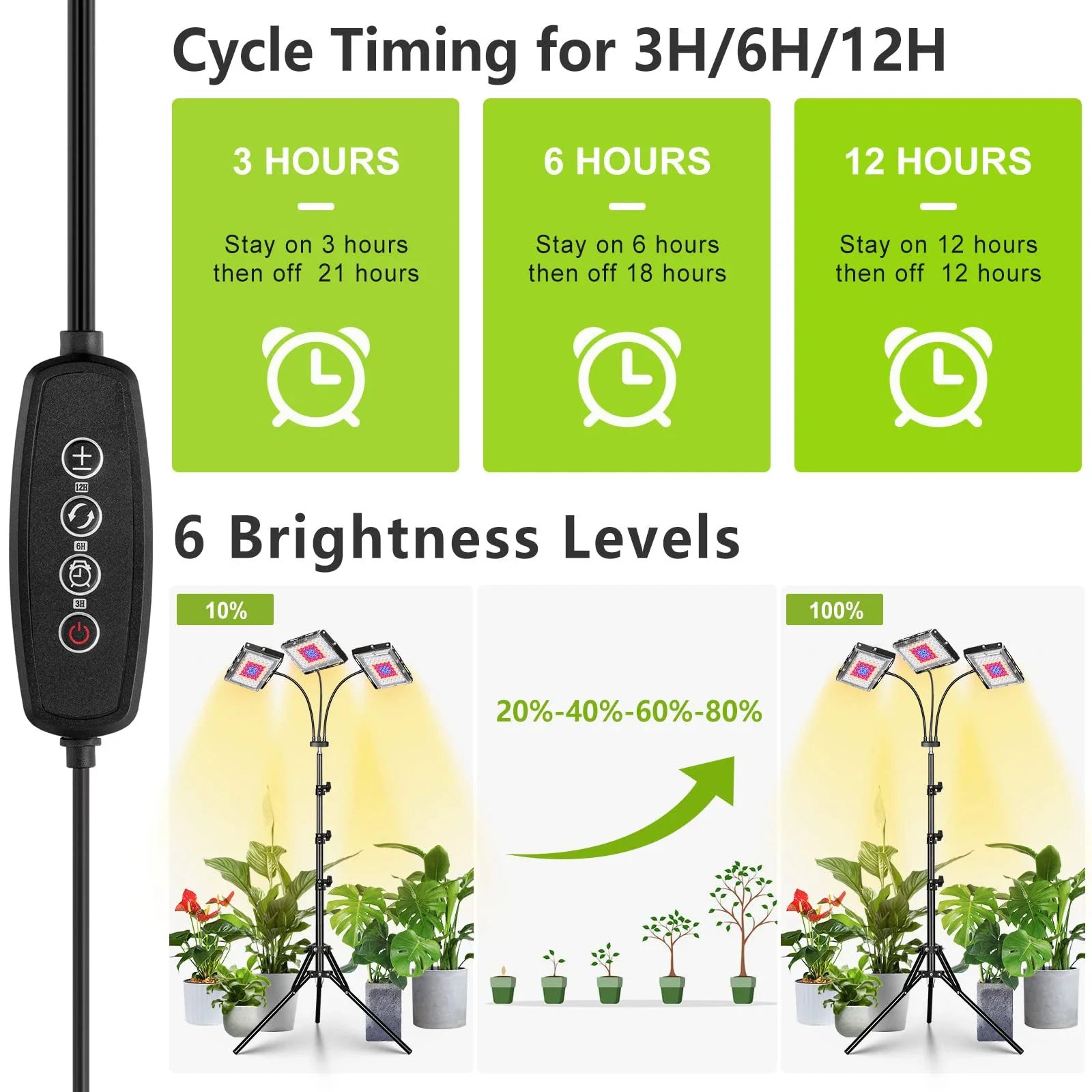 【Automatic Timer 3H/6H/12H】 Our floor grow light features 3 timing settings with 3H/6H/12H options. When powered, it will automatically turn on and off every day according to your settings, providing convenient care for your plants even when you're away from home.