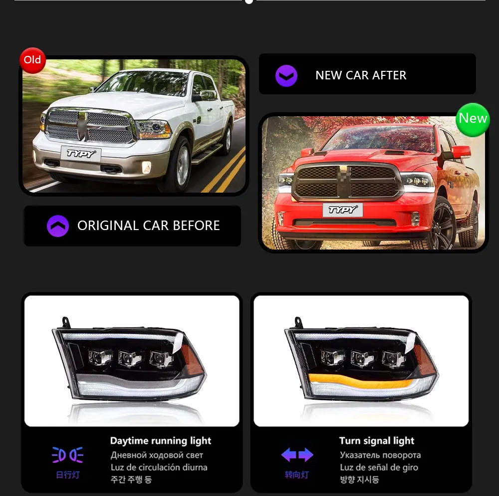 LED Headlight Assembly For Dodge Ram 1500 2009-2019 Car LED Lights Headlamps DRL Daytime Running Light Turn Signal, 1 Set