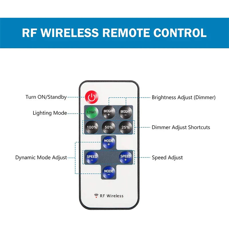 - 10 different brightness, 10 dynamic modes and 10 different speed.