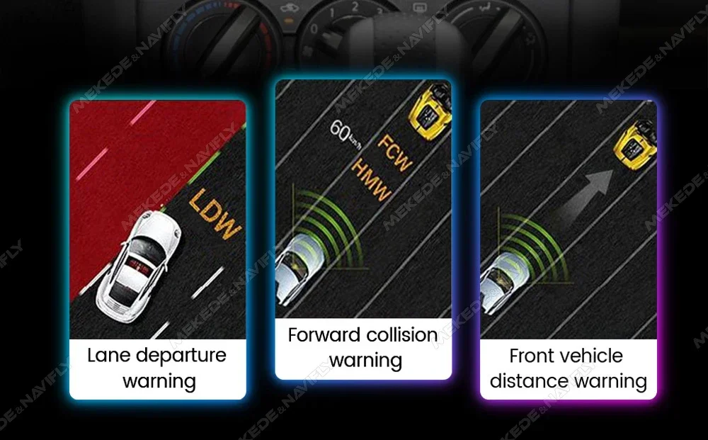 Distance prediction, collision warning and lane departure warning for safer driving.