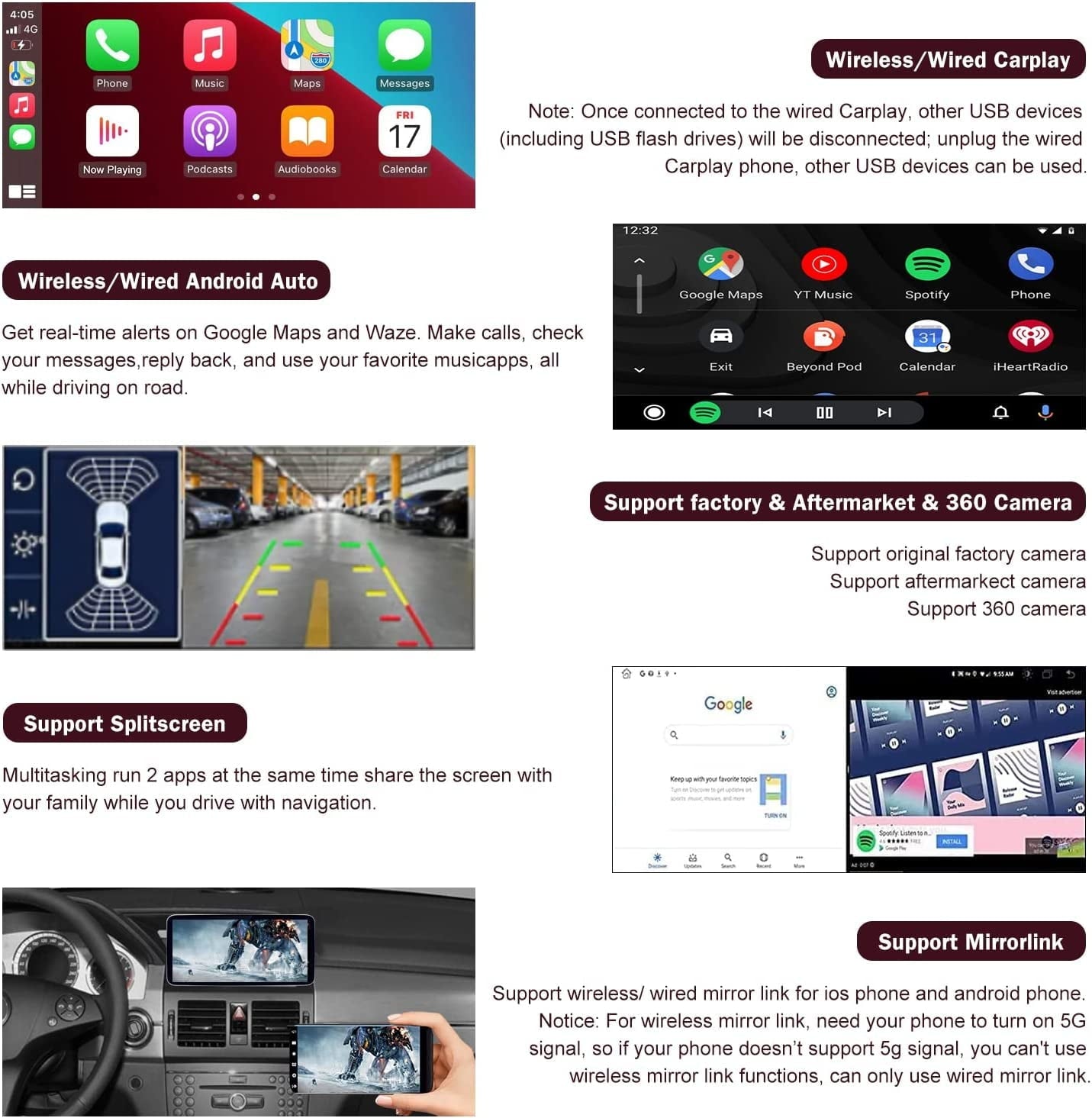 - Support Split Screen, Also support wireless/wired mirror link functions for ios phone and android phone, but if you use wireless mirror link functions, need to get a 5g signal of your phone.