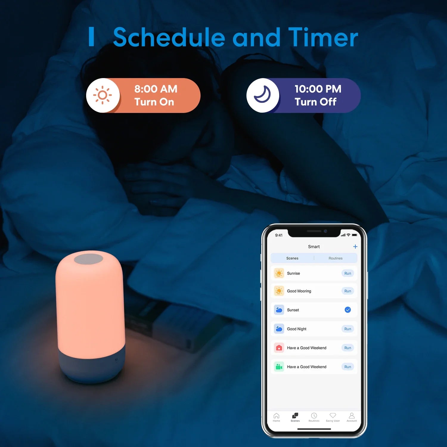 You can schedule the smart LED lamp to turn on and off automatically by your daily routine. Save energy when lights are not needed or left on by accident. Sunrise / sunset mode supported.