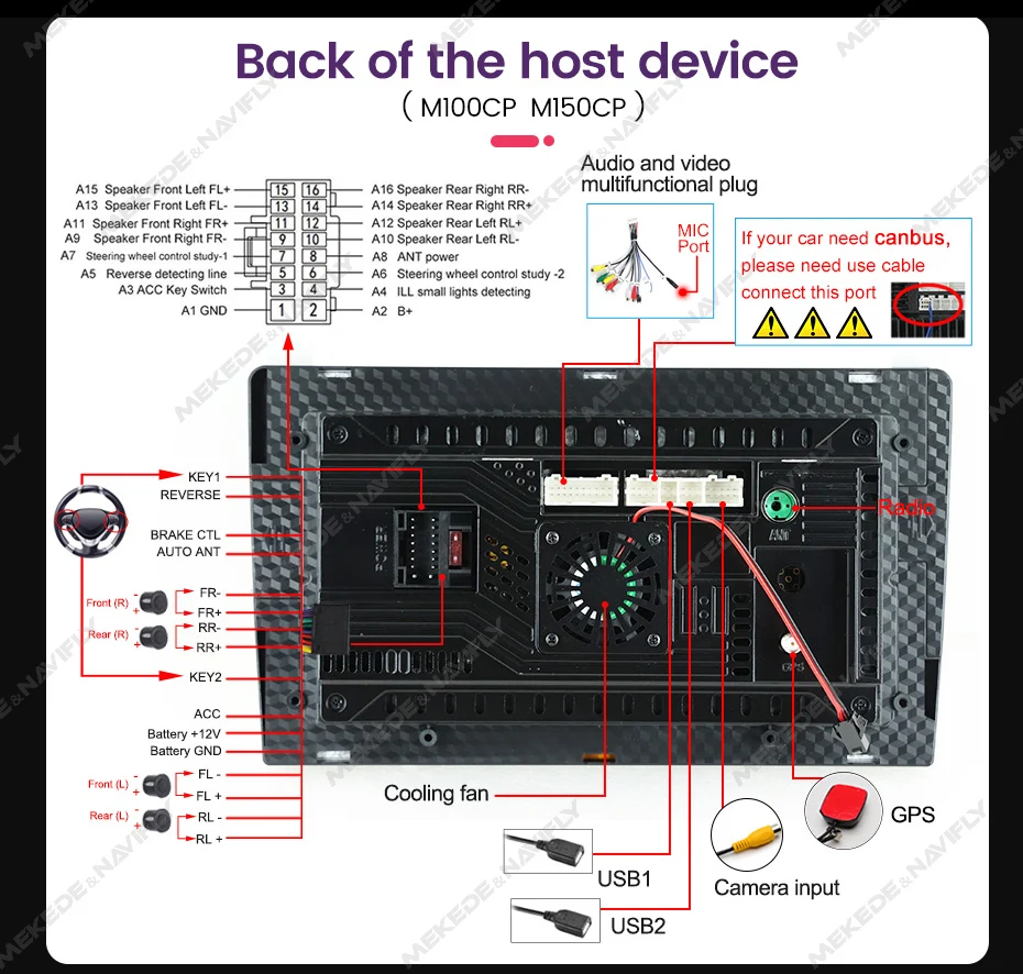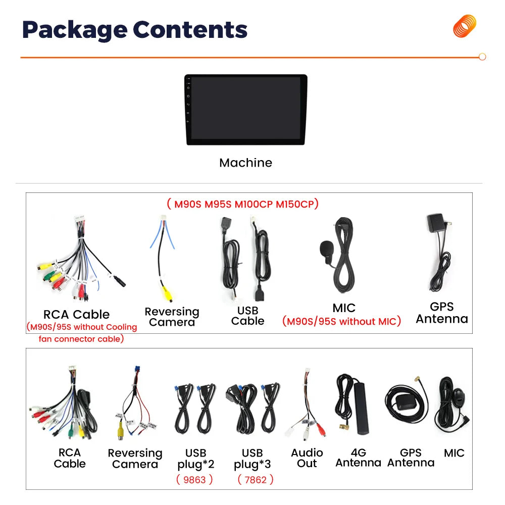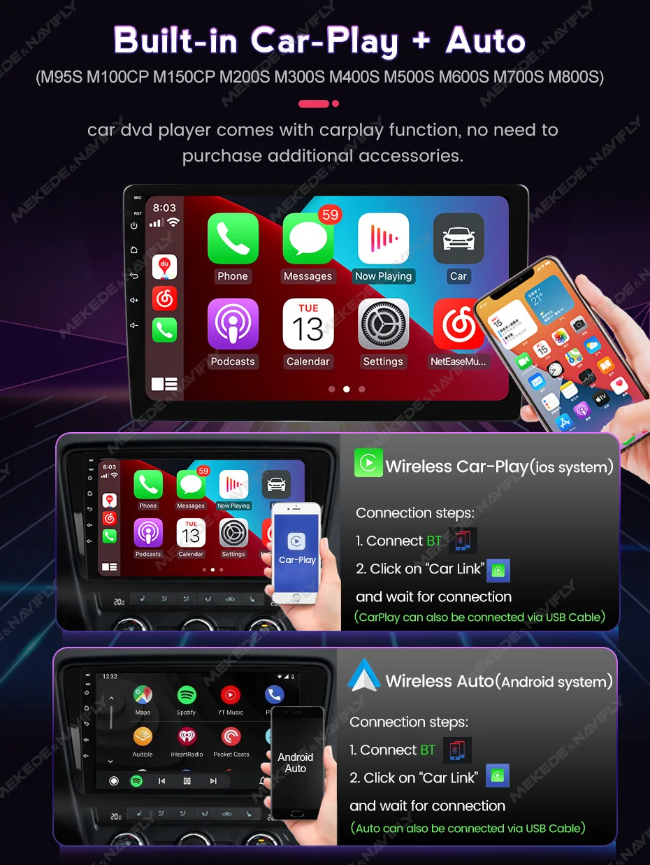 >Built-in Carplay and Android Auto function . ( M95S M100CP M150CP M200S M300S M400S M500S M600S M700S M800S) > Phone| Music | Maps| Podcasts etc.. > Built-in Wireless + wired Carplay and Wireless Android Auto function. You can connect the phone with Android screen together, control and handle mobiles via device, open your safe driving life.