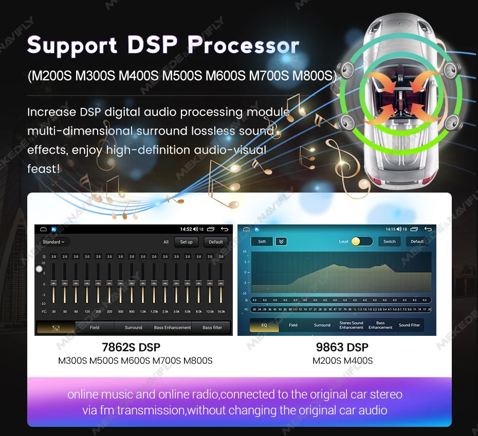 >Support DSP Processor (M200S M300S M400S M500S M600S M700S M800S) .Increase DSP digital audio processing module multi- dimensional surround lossless sound effects.enjoy high-definition audio-visual feast!