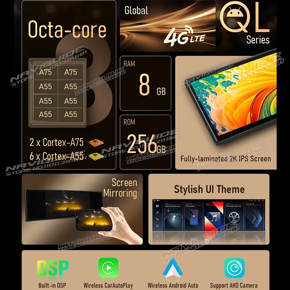Function:GPS Navi / Google / WIFI / 4G SIM Card/ BT / Wireless Carplay / Android Auto / USB / Music / Video / Split Screen / Steering Wheel Control / Support AHD / CVBS Camera Video / Support Car Original Function / Colorful Dashboard /Fast Boot Screen