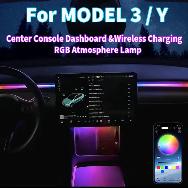 NEW For Tesla Model 3 Y Center Console Dashboard Wireless Charging RGB Neon LED Light Strip Musical Rhythm USB Power APP Control