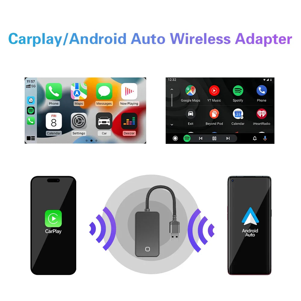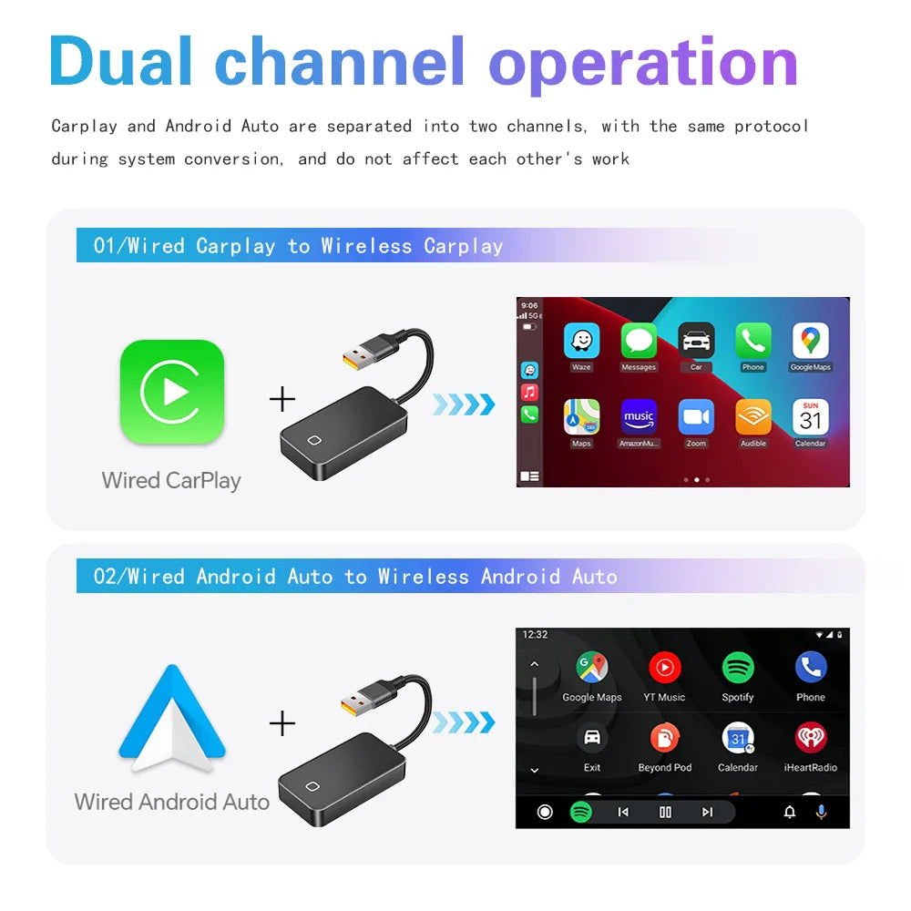 The function of this product is to convert the original car wired Carplay to wireless carplay (only iPhone can connect) and wired Android Auto to wireless Android Auto (only Android phones can connect)