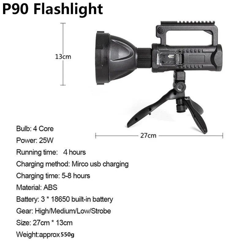 NEW P90 Portable Powerful LED Flashlight Handheld Searchlight USB Rechargeable Spotlight Waterproof Torch Work Light Outdoor power tools