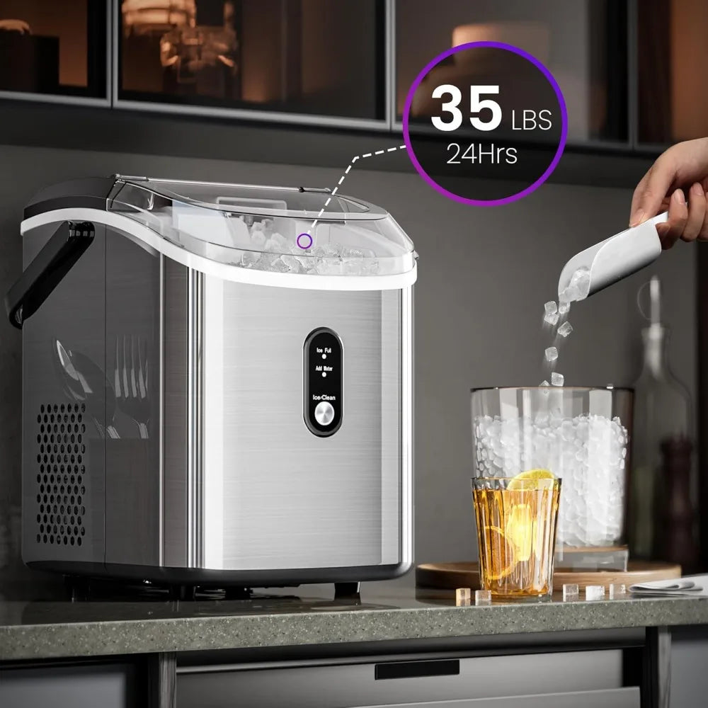 - 【Rapid Continuous Ice Production】 nugget ice maker to produce up to 35 lbs of pebble ice per day. Equipped with R600A refrigerant, ice production in 7 minutes and comes with an ice basket that holds 1.5 pounds, you'll never run out of ice.You can enjoy ice cubes anytime, anywhere