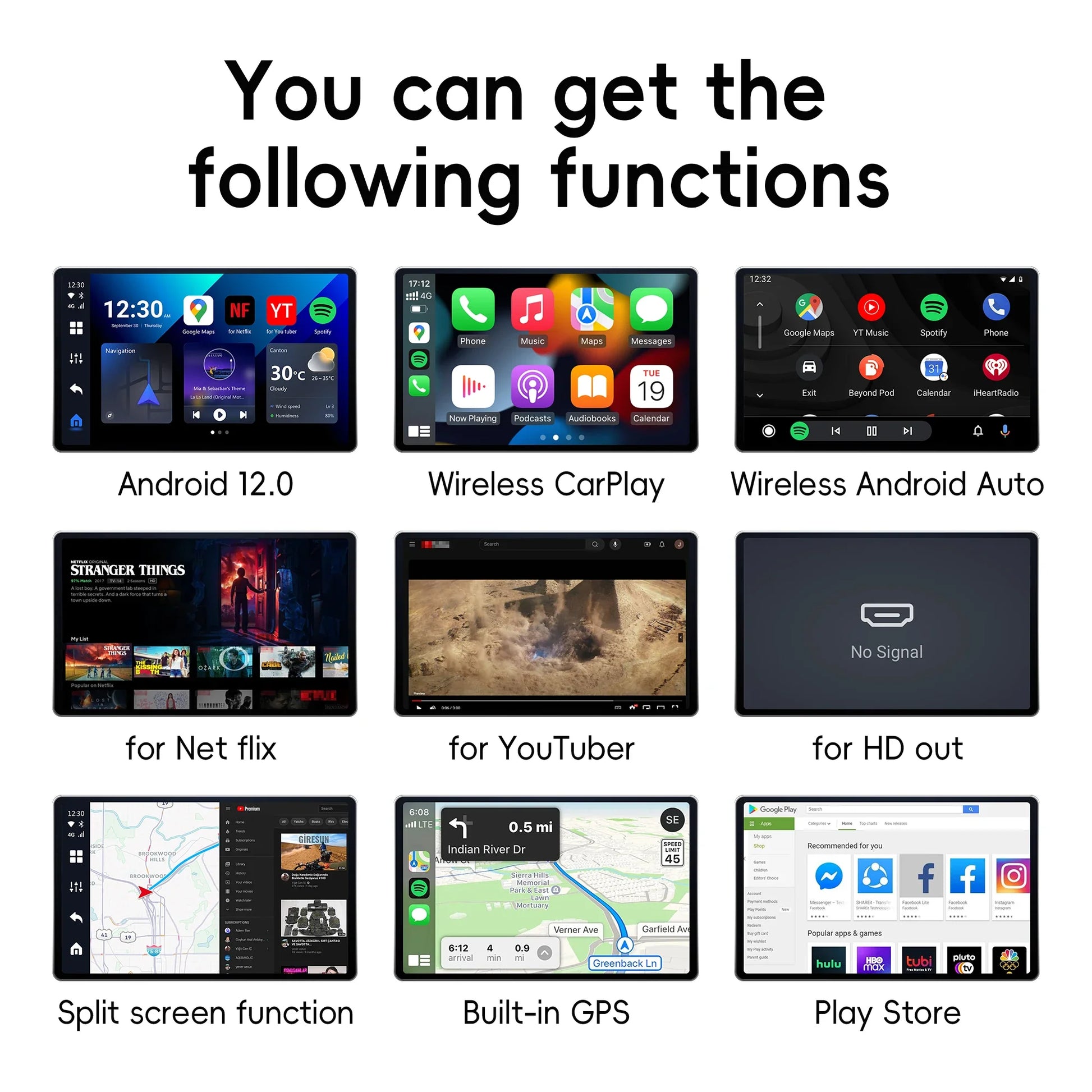 P3 runs on Android 12 operating system. It offers a simple and user-friendly interface. It not only supports wireless CarPlay and wireless Android auto, but also enjoys the convenience of a fully integrated entertainment system in your car with access to popular apps such as for Netflix, for IP TV and more.