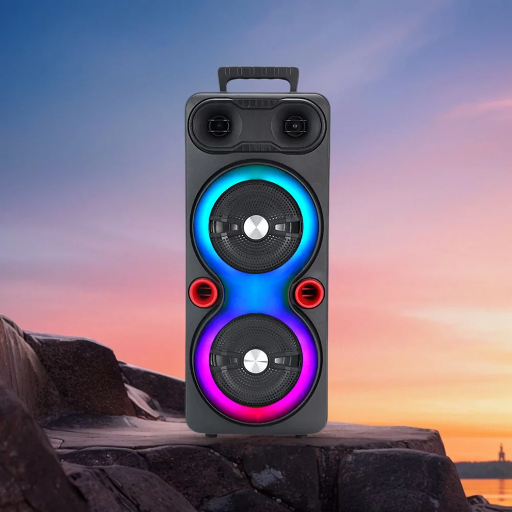 1. Powerful Sound Experience: Our dual subwoofer speakers deliver impressive sound quality with deep bass, enhanced by built-in LED lights that pulse with the music. Enjoy immersive 360° stereo sound that elevates your listening experience, whether indoors or outdoors.