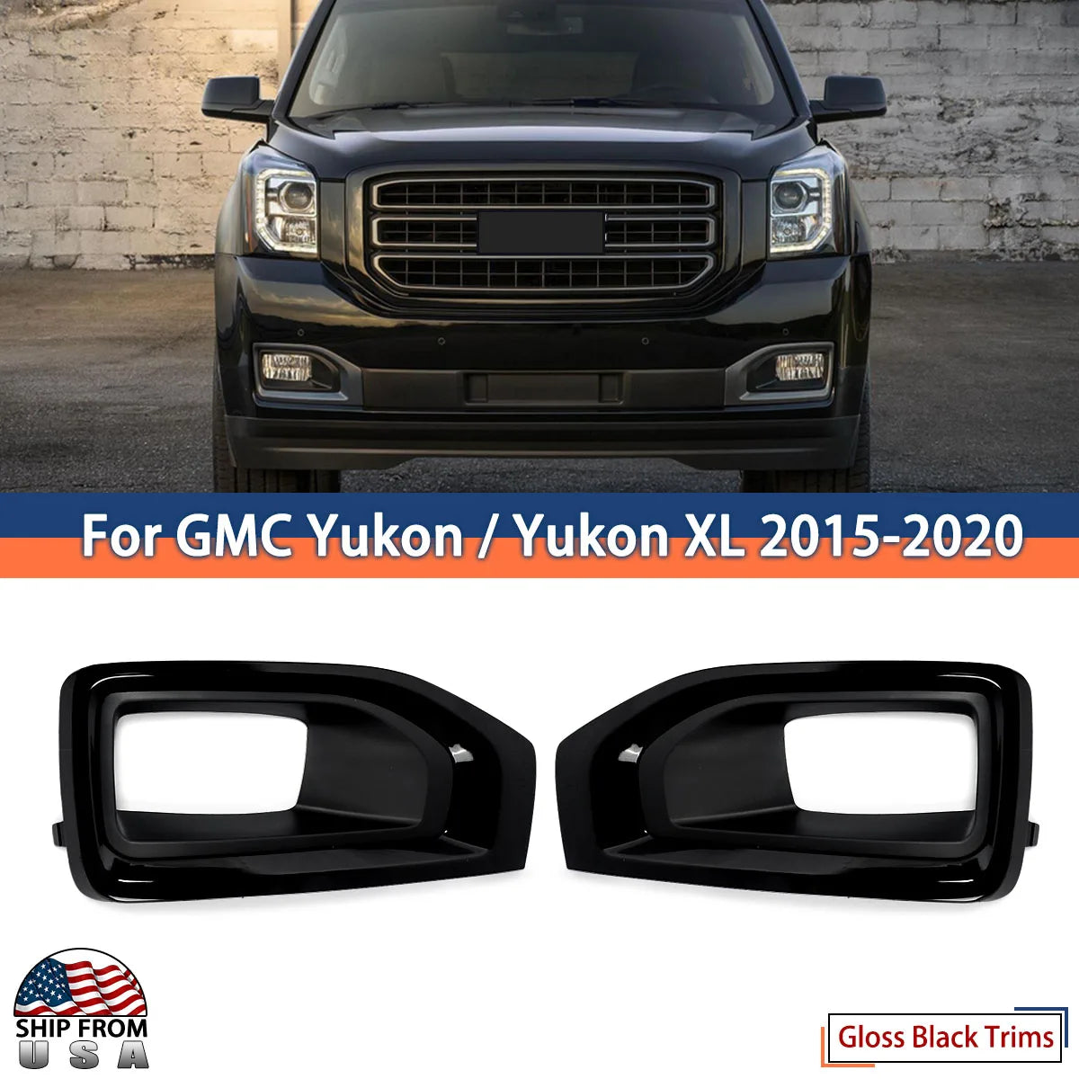 Pair Glossy Black Fog Lights Frame Shell Replace For 2015-2020 GMC Yukon / Yukon XL Fog Lights Bezel Cover Trim Chrome Auto Part
