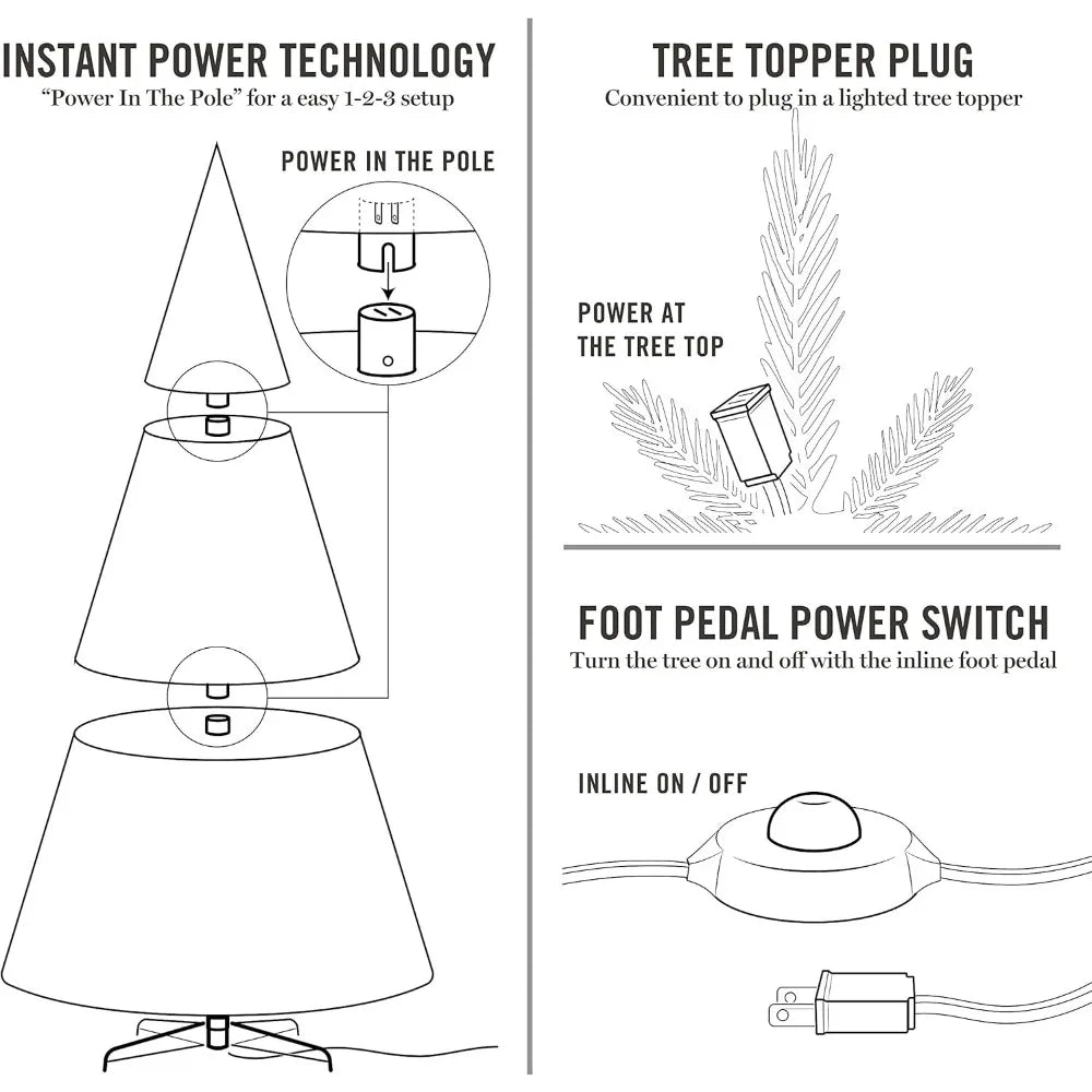 - Patented "power in the pole" Instant Power Technology carries power through the tree from the inline foot pedal up to the discreet Topper Plug for an extension-cord free tree topper