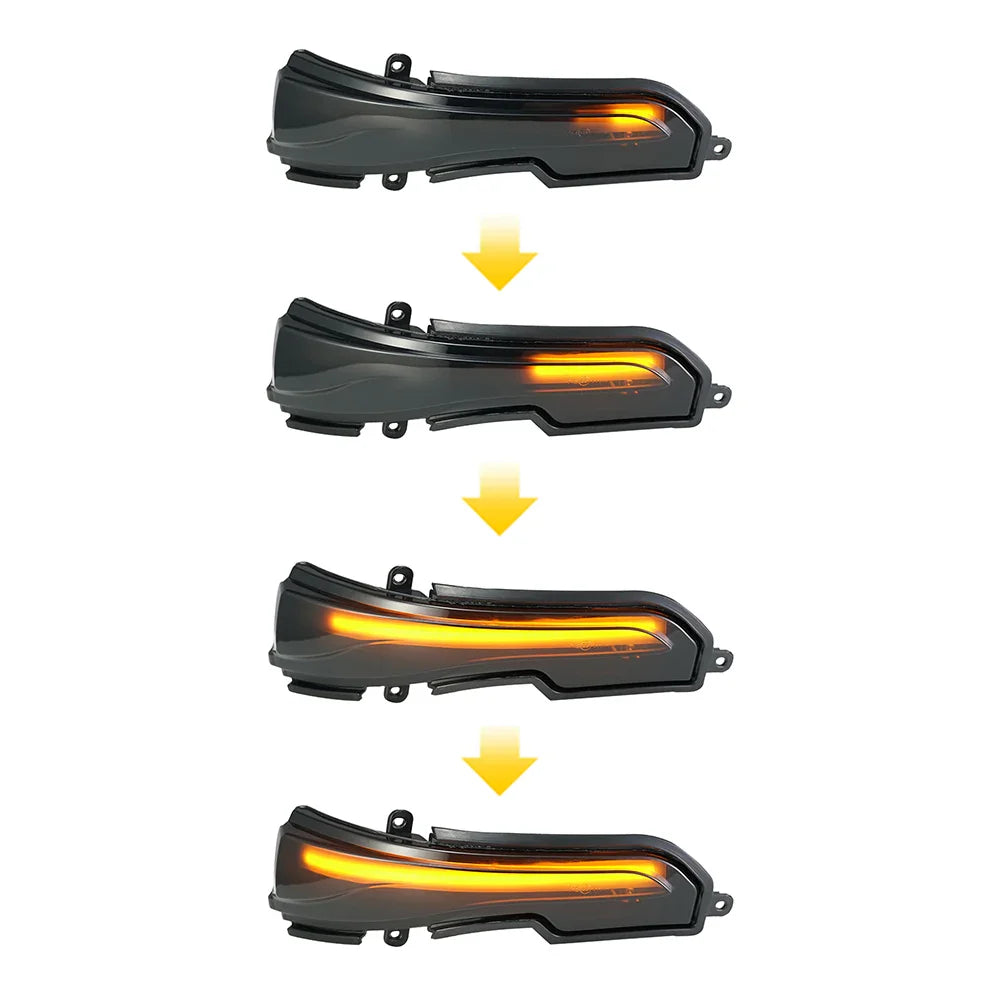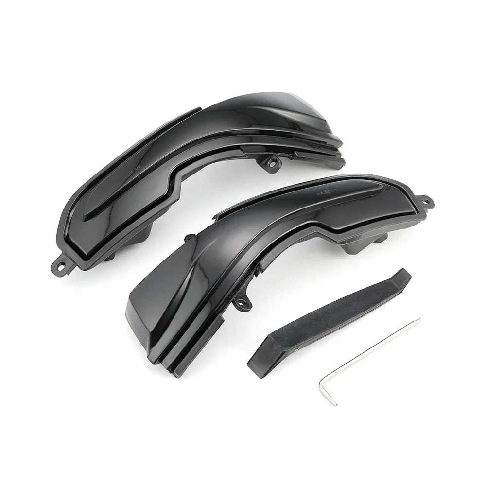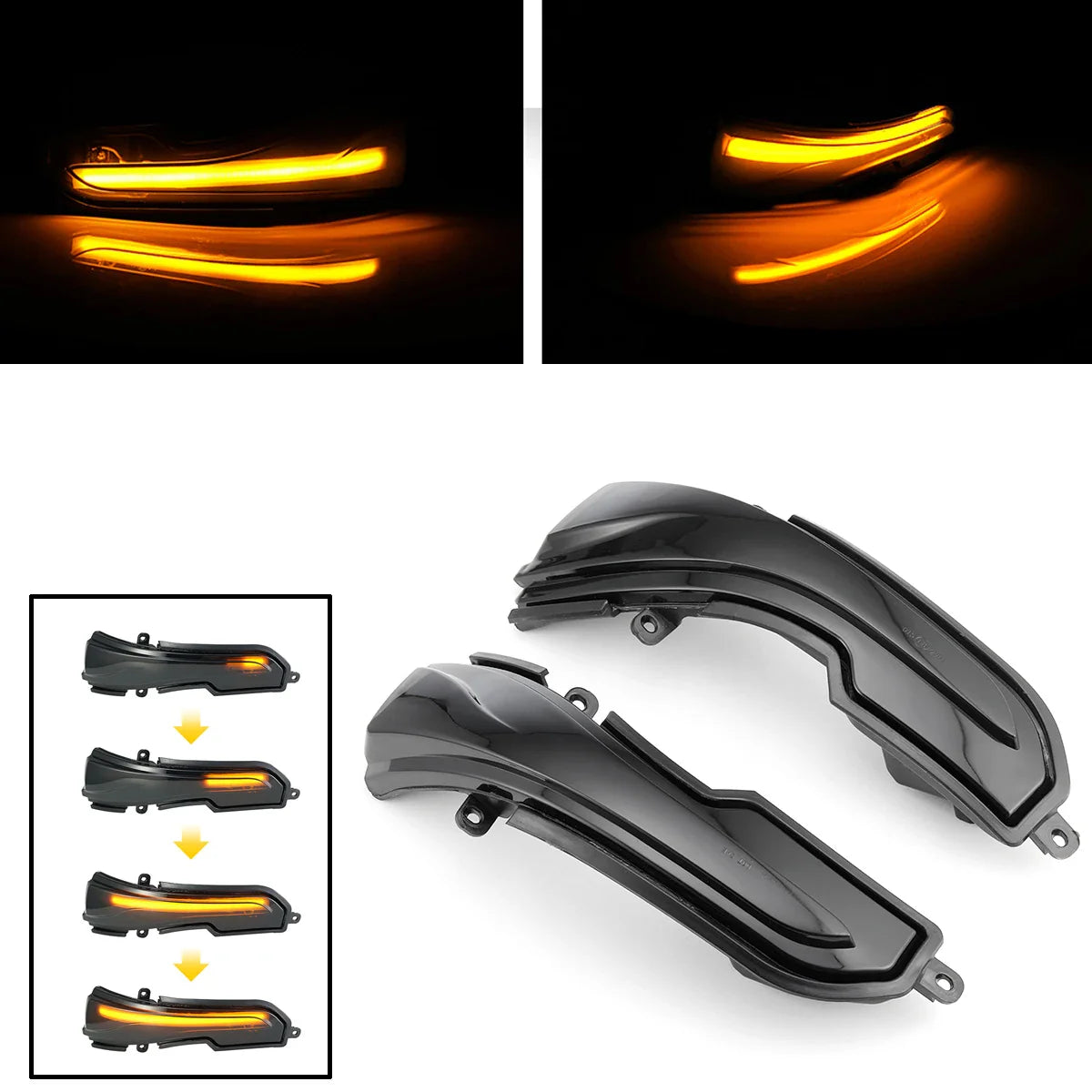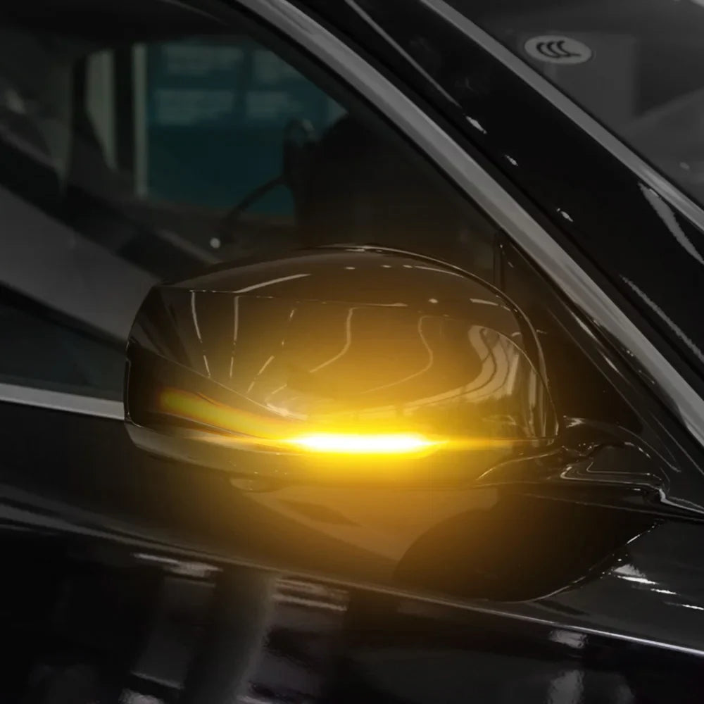 2 rearview mirror indicator lights. The black and black lens LED left and right mirror turn signals directly replace the original OEM LH RH mirror turn signals, full of dynamic super bright light, and the transponder flashes in turn.