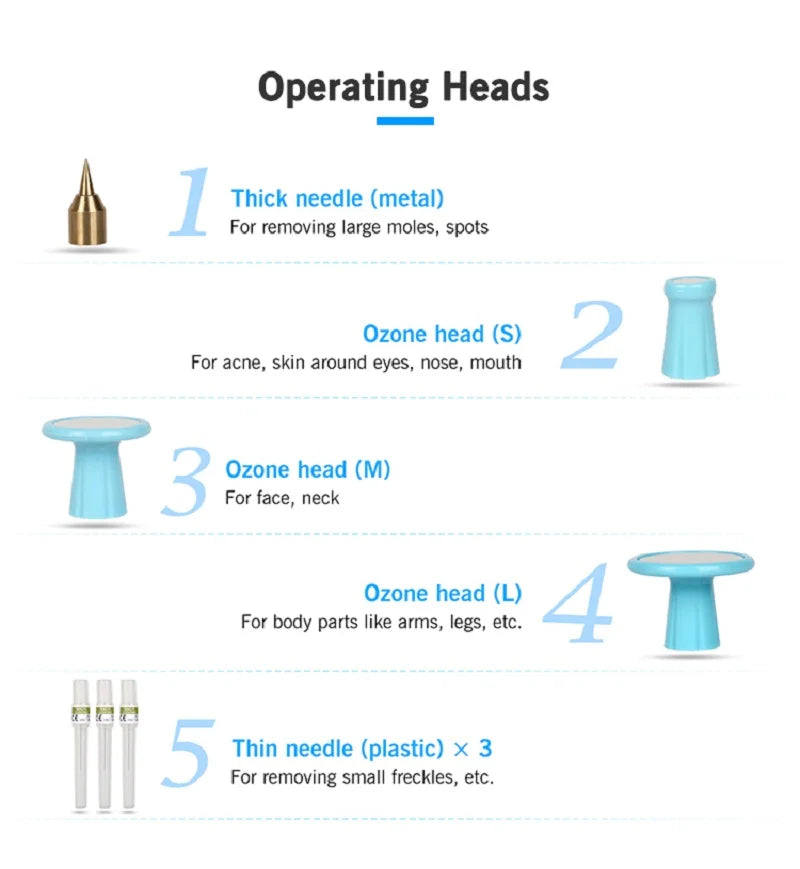 Mole removal: By converting electricity into heat energy to burn spots or moles on skin to let it fall off naturally. Ozone helps clean and sterilize skin, accelerate wound healing and enhance skin immunity.Plasma helps reduce acne and inflammation, whiten and brighten skin, increase skin penetration of skincare products, promote collagen regeneration to reduce wrinkles.