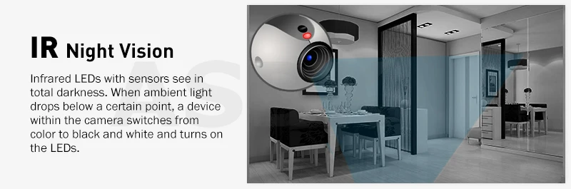Auto True Day/Night capabilities. When ambient light drops below a certain point, a device within the camera switches from color to black and white and turns on the LEDs.