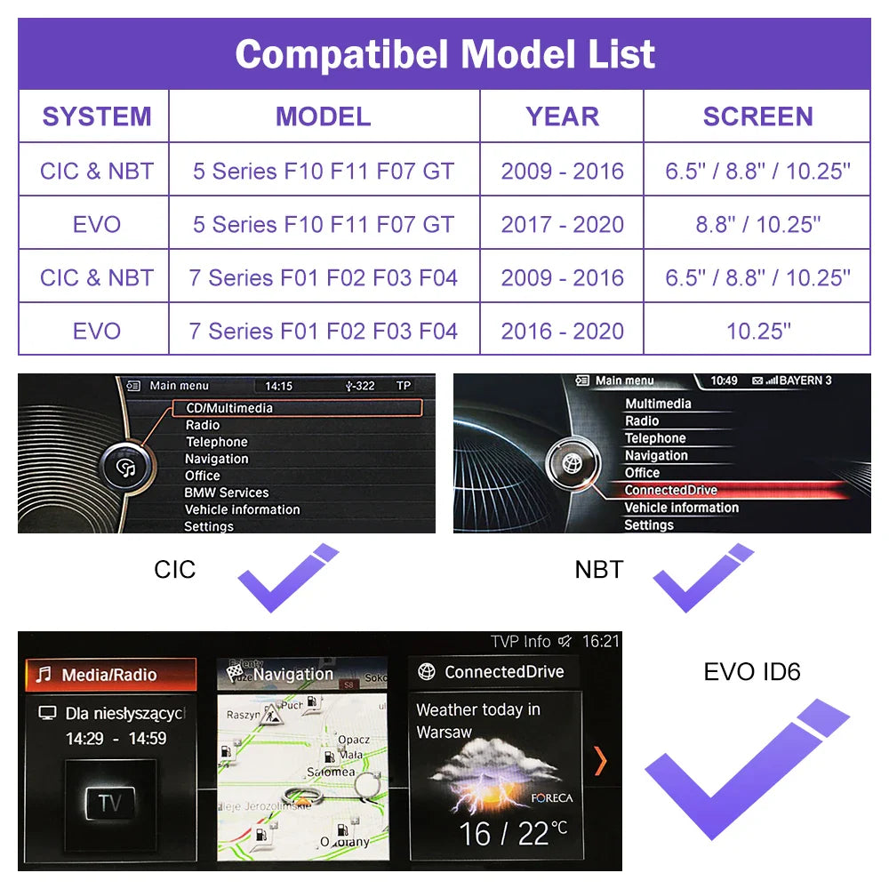 7 Series F01 F02 F03 F04 : 2009 - 2016 (for both CIC System and NBT System, original 6.5 ", 8.8 " & 10.25" screen)