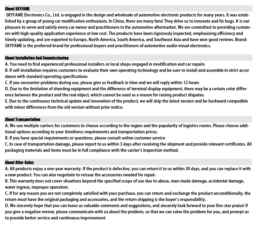 Serious statement: Due to changes in international transportation and tax regulations, as well as changes in customs import policies for such goods and potential risks, according to the agreement, the buyer's return will be destroyed. In addition to the loss of the goods themselves, there will be additional costs for two-way transportation, testing, and destruction, with a total cost exceeding several times the selling price of the goods. Therefore, in principle, we will no longer accept any unconditional return and refund requests. Therefore, we require buyers to carefully consider before placing an order and avoid blind ordering. If the buyer is unsure, they can provide the original car information to customer service. We will provide guidance on obtaining the original car information and choose the appropriate kit under the guidance of professionals. We do not welcome blind and experimental orders, which we will consider as malicious orders, The consequences and losses resulting from incorrect ordering options will be borne by the buyer.