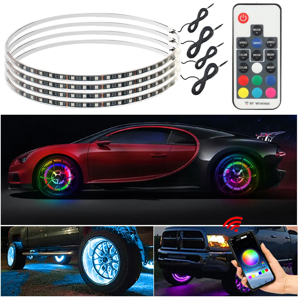 4PCS Car Hub Lights Symphony APP Atmosphere Lights Remote Control Symphony 15.5 inch Neon Car Trim Lights Waterproof Kit 12V