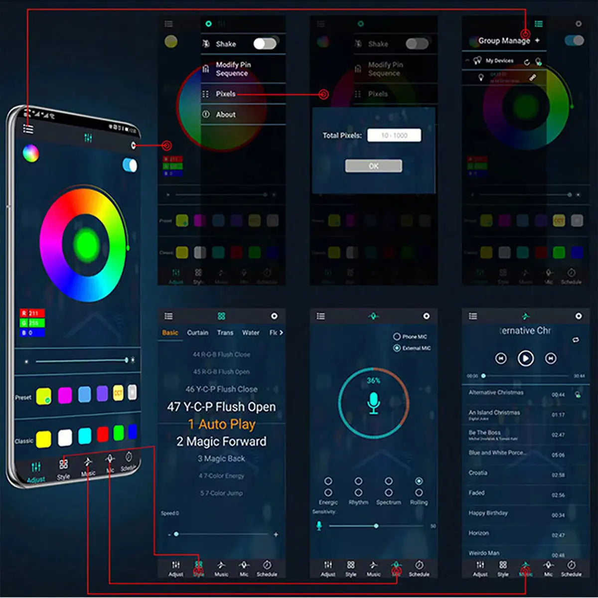 Attributes: Waterproof, APP control.Remote control
