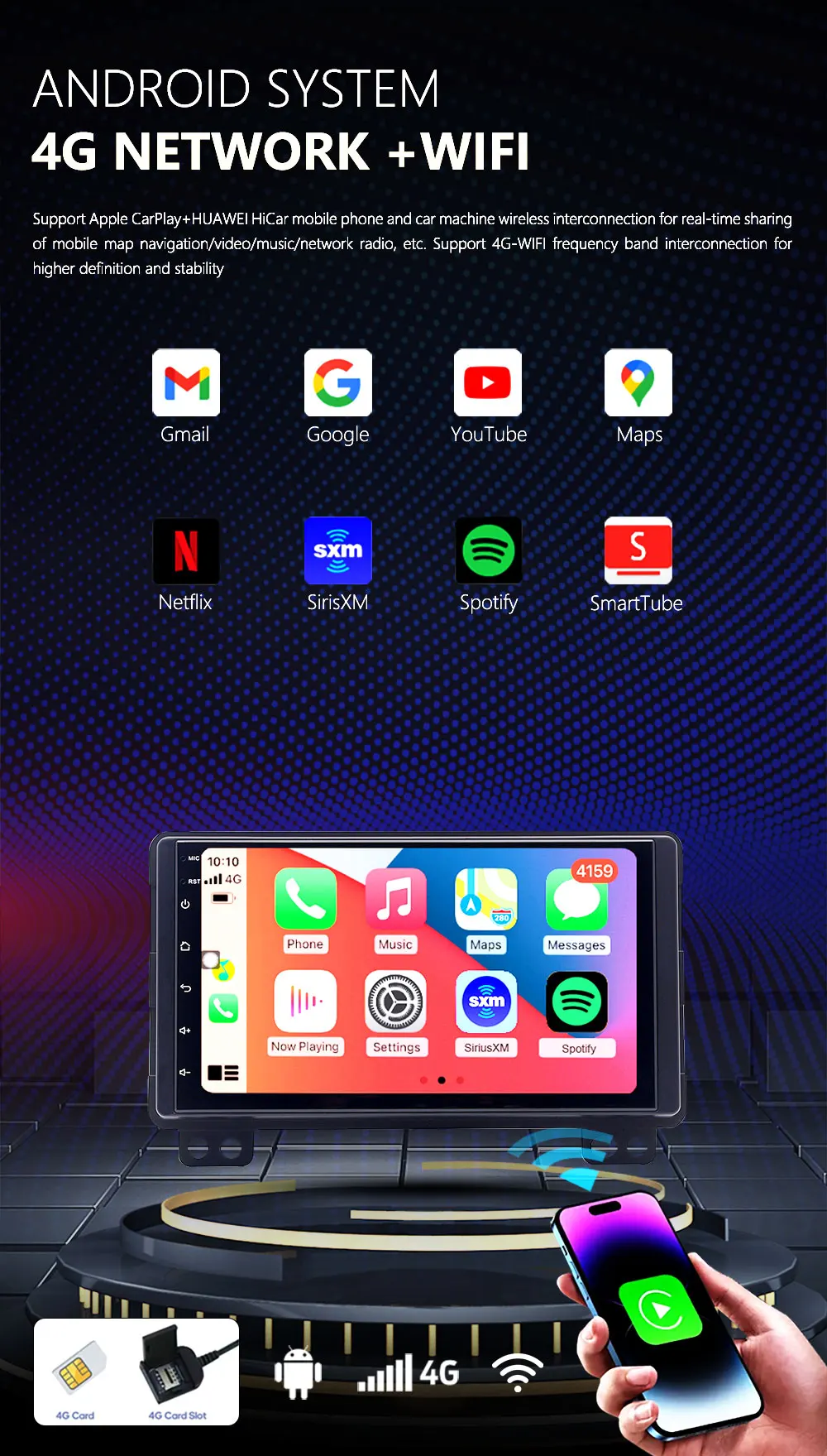 Connectivity: Supports Android Auto and CarPlay for hands-free access to your favorite apps. Radio also support Bluetooth and wifi.